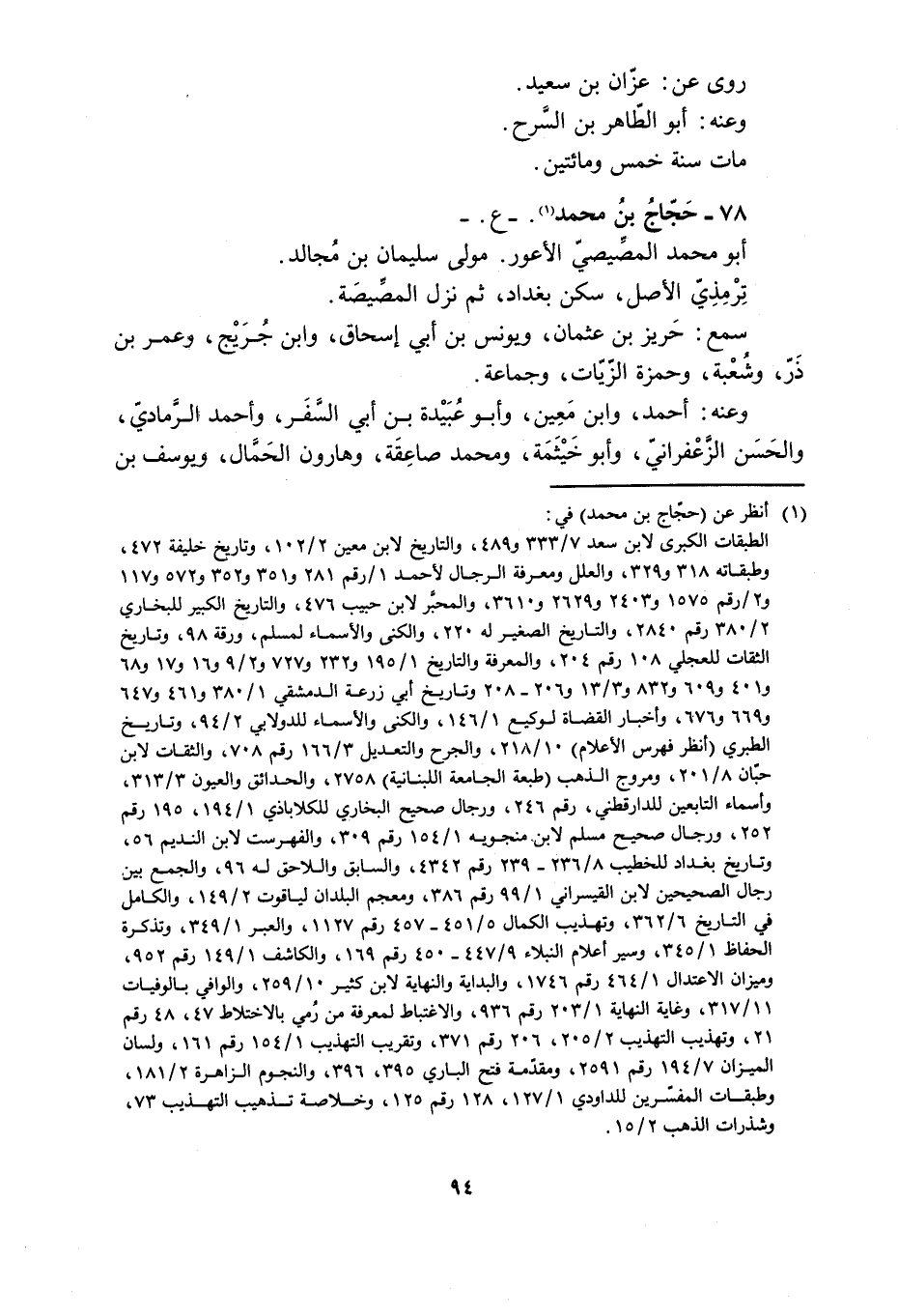 78- حجّاج بن محمد [1] . - ع. - أبو محمد المصِّيصيّ الأعور. مولى سليمان بْن مُجالد.