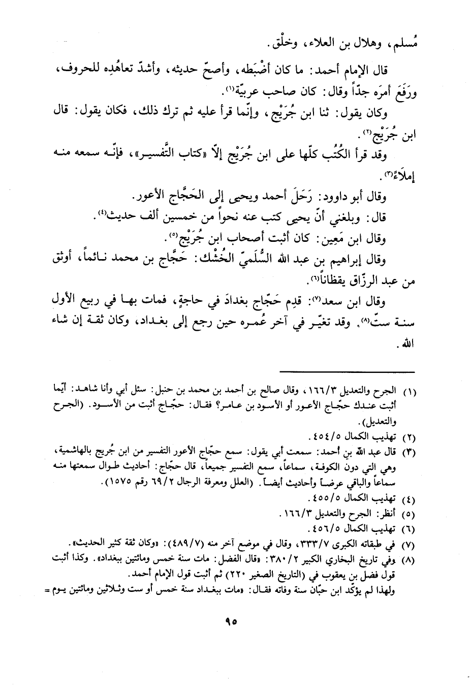 [3] قال عبد الله بن أحمد: سمعت أبي يقول: سمع حجّاج الأعور التفسير من ابن جريج بالهاشمية، وهي التي دون الكوفة، سماعا، سمع التفسير جميعا، قال حجّاج: أحاديث طوال سمعتها منه سماعا والباقي عرضا وأحاديث أيضا. (العلل ومعرفة الرجال 2/ 69 رقم 1575) .