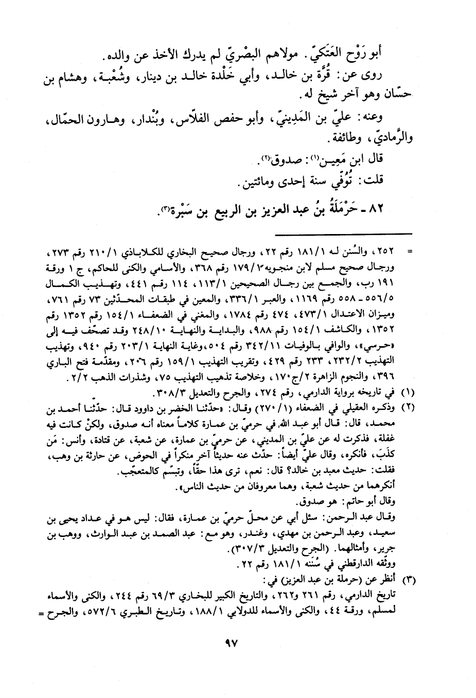 [ () ] 252، والسنن له 1/ 181 رقم 22، ورجال صحيح البخاري للكلاباذي 1/ 210 رقم 273، ورجال صحيح مسلم لابن منجويه 1/ 179 رقم 368، والأسامي والكنى للحاكم، ج 1 ورقة 191 رب، والجمع بين رجال الصحيحين 1/ 113، 114 رقم 441، وتهذيب الكمال 5/ 556- 558 رقم 1169، والعبر 1/ 336، والمعين في طبقات المحدّثين 73 رقم 761، وميزان الاعتدال 1/ 473، 474 رقم 1784، والمغني في الضعفاء 1/ 154 رقم 1352 رقم 1352، والكاشف 1/ 154 رقم 988، والبداية والنهاية 10/ 248 وقد تصحّف فيه إلى «حرسي» ، والوافي بالوفيات 11/ 342 رقم 504، وغاية النهاية 1/ 203 رقم 940، وتهذيب التهذيب 2/ 232، 233 رقم 429، وتقريب التهذيب 1/ 159 رقم 206، ومقدّمة فتح الباري 396، والنجوم الزاهرة 2/ ج 170، وخلاصة تذهيب التهذيب 75، وشذرات الذهب 2/ 2.