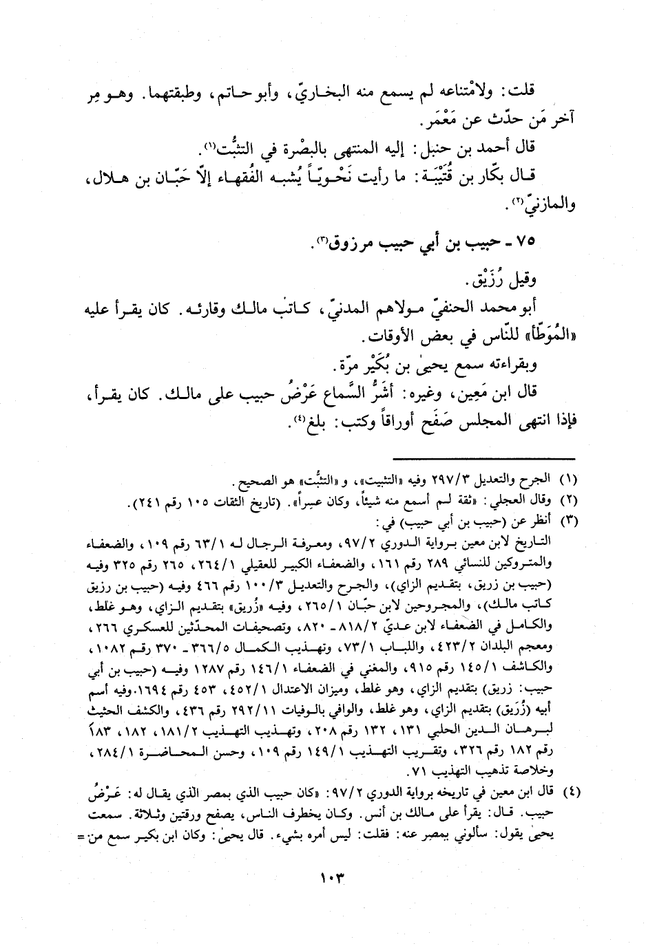 [4] قال ابن معين في تاريخه برواية الدوري 2/ 97: «كان حبيب الّذي بمصر الّذي يقال له: عرض حبيب. قال: يقرأ على مالك بن أنس. وكان يخطرف الناس، يصفح ورقتين وثلاثة. سمعت يحيى يقول: سألوني بمصر عنه: فقلت: ليس أمره بشيء. قال يحيى: وكان ابن بكير سمع من