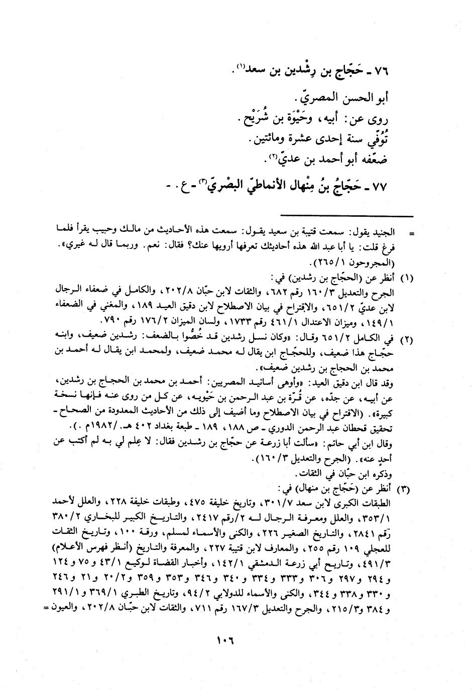 [2] في الكامل 2/ 651 وقال: «وكان نسل رشدين قد خصّوا بالضعف: رشدين ضعيف، وابنه حجّاج هذا ضعيف، وللحجّاج ابن يقال له محمد ضعيف، ولمحمد ابن يقال له أحمد بن محمد بن الحجاج بن رشدين ضعيف» .