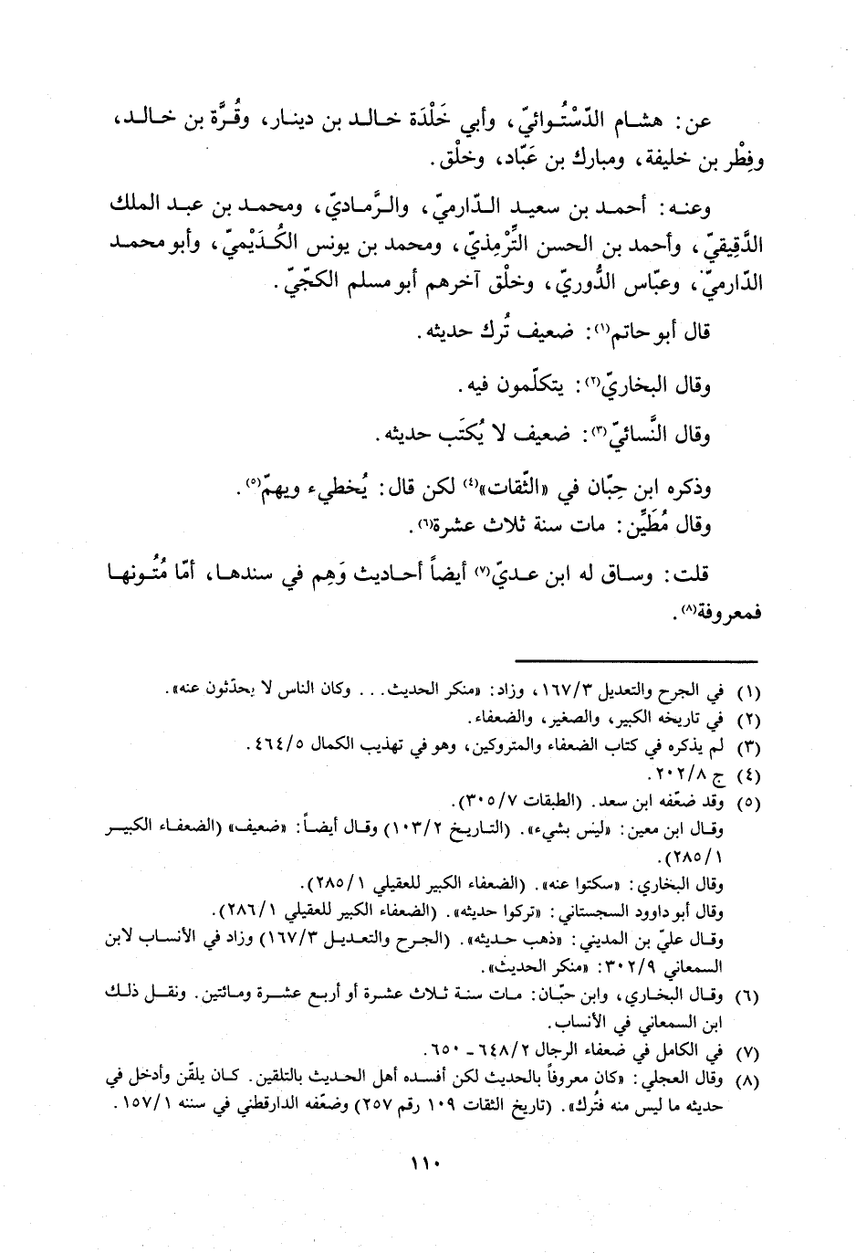 [1] في الجرح والتعديل 3/ 167، وزاد: «منكر الحديث ... وكان الناس لا يحدّثون عنه» .
