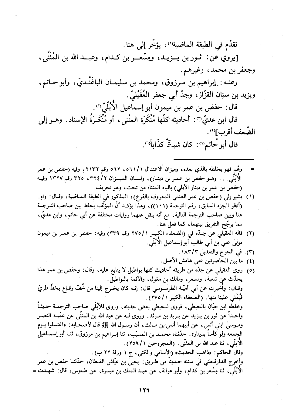 [1] يشير إلى (حفص بن عمر العدني المعروف بالفرخ) ، المذكور في الطبقة الماضية، وقال: واه.