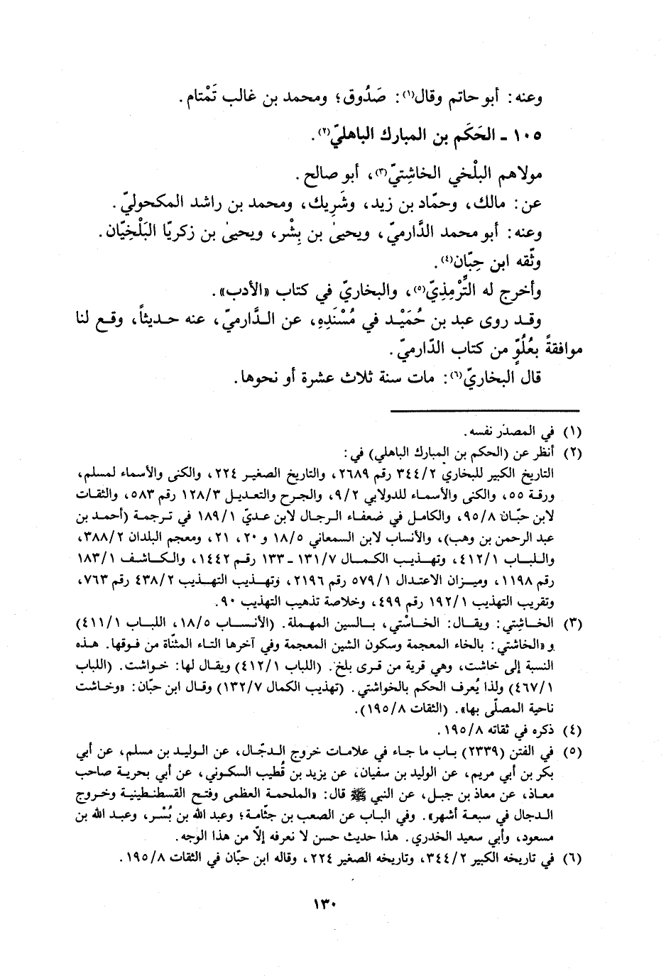 [3] الخاشتي: ويقال: الخاستي، بالسين المهملة. (الأنساب 5/ 18، اللباب 1/ 411) و «الخاشتي: بالخاء المعجمة وسكون الشين المعجمة وفي آخرها التاء المثنّاة من فوقها. هذه النسبة إلى خاشت، وهي قرية من قرى بلخ. (اللباب 1/ 412) ويقال لها: خواشت. (اللباب 1/ 467) ولذا يعرف الحكم بالخواشتي. (تهذيب الكمال 7/ 132) وقال ابن حبّان: «وخاشت ناحية المصلّى بها» . (الثقات 8/ 195) .