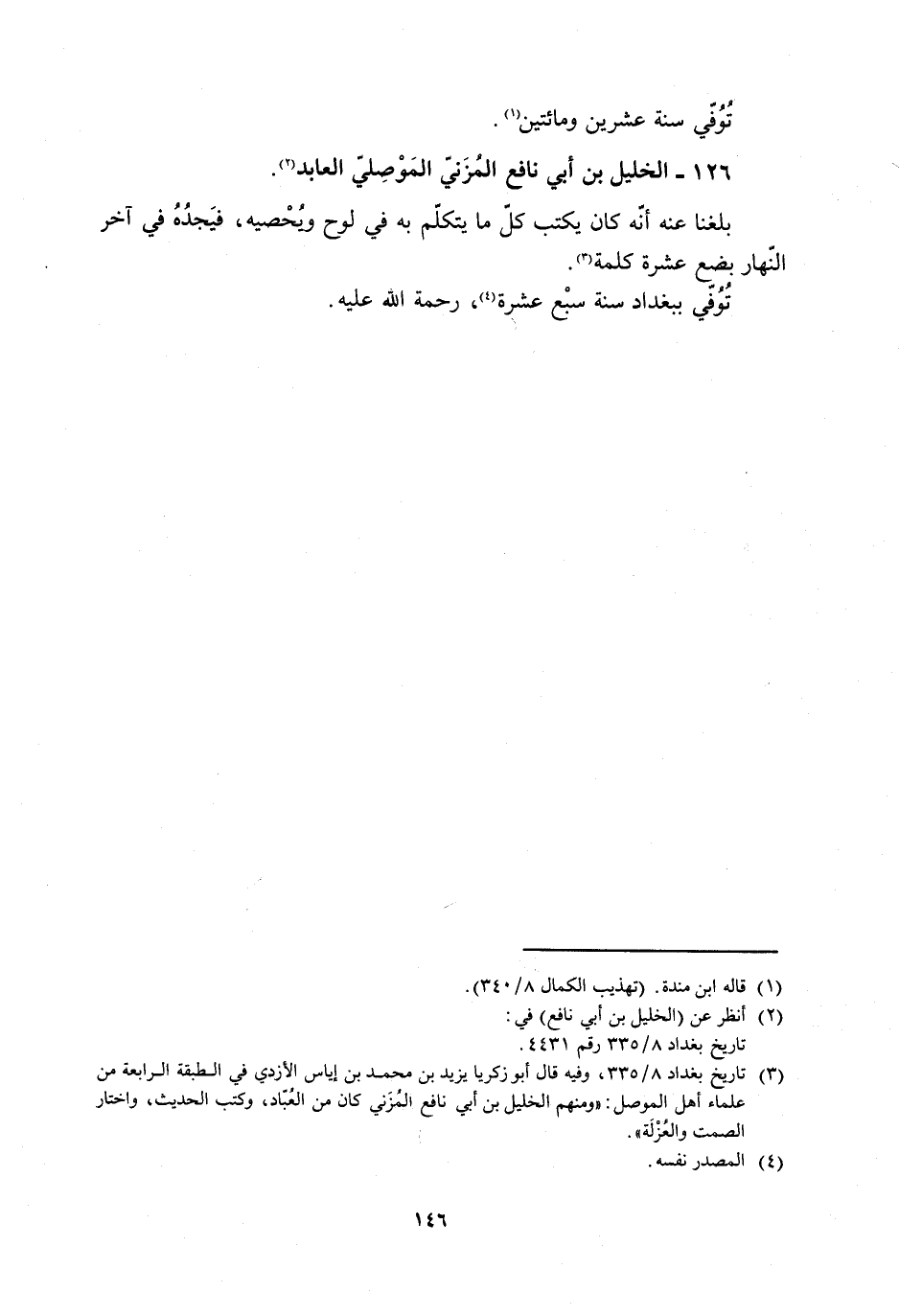 [3] تاريخ بغداد 8/ 335، وفيه قال أَبُو زَكَرِيَّا يَزِيدُ بْنُ مُحَمَّدِ بْنِ إِيَاسٍ الأزدي في الطبقة الرابعة من علماء أهل الموصل: «ومنهم الخليل بن أبي نافع المزني كان من العبّاد، وكتب الحديث، واختار الصمت والعزلة» .