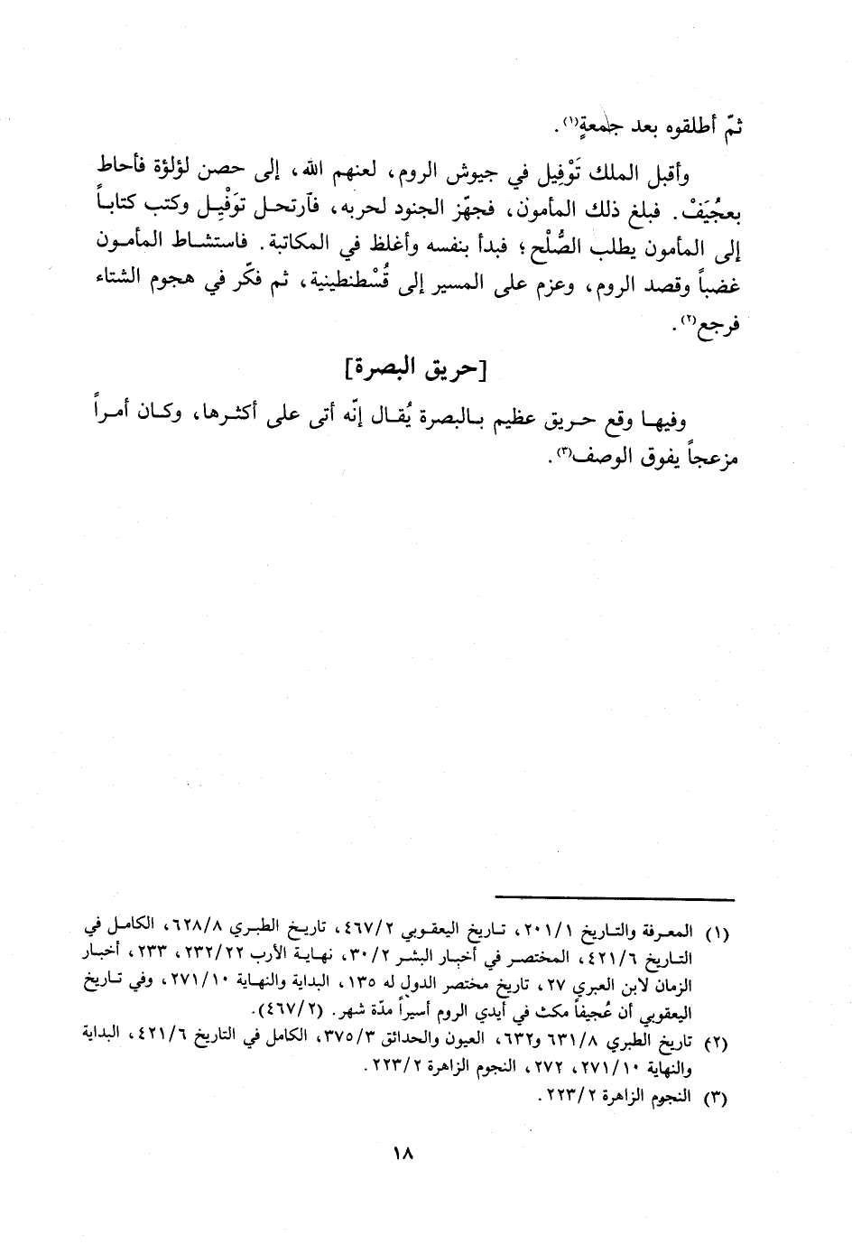 [1] المعرفة والتاريخ 1/ 201، تاريخ اليعقوبي 2/ 467، تاريخ الطبري 8/ 628، الكامل في التاريخ 6/ 421، المختصر في أخبار البشر 2/ 30، نهاية الأرب 22/ 232، 233، أخبار الزمان لابن العبري 27، تاريخ مختصر الدول له 135، البداية والنهاية 10/ 271، وفي تاريخ اليعقوبي أن عجيفا مكث في أيدي الروم أسيرا مدّة شهر. (2/ 467) .