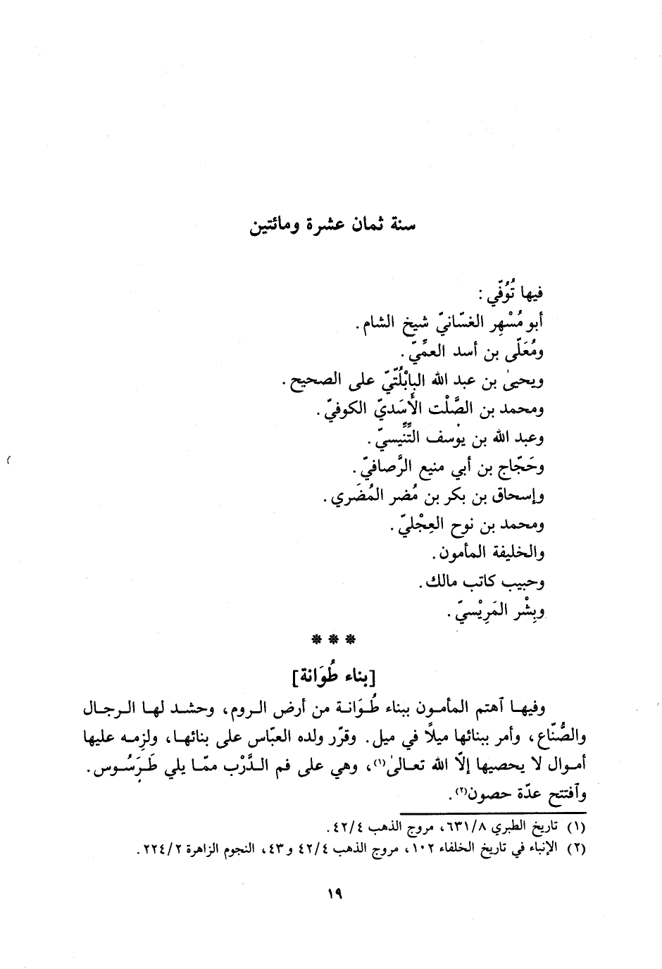 وفيها اهتم المأمون ببناء طُوَانة من أرض الروم، وحشد لها الرجال والصُّنّاع، وأمر ببنائها ميلًا في ميل. وقرّر ولده العبّاس على بنائها، ولزِمه عليها أموال لَا يحصيها إلّا الله تعالى [1] ، وهي على فم الدَّرْب ممّا يلي طرسوس.