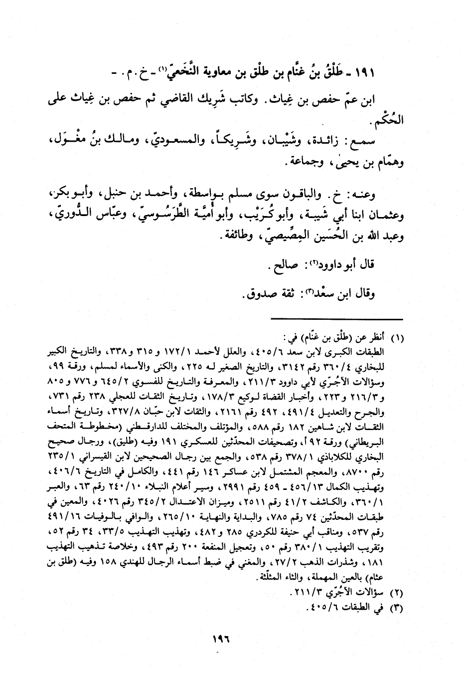191- طَلْقُ بنُ غنَّام بن طلْق بن معاوية النَّخَعيّ [1]- خ. م. - ابن عمّ حفص بن غياث. وكاتب شَرِيك القاضي ثم حفص بن غياث على الحُكْم.
