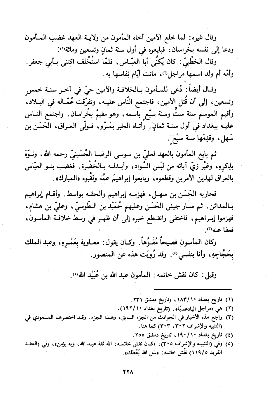 [5] وفي (التنبيه والإشراف 305) : «كان نقش خاتمه: الله ثقة عبد الله، وبه يؤمن» ، وفي (العقد الفريد 5/ 119) نقش خاتمه: «سل الله يعطك» .