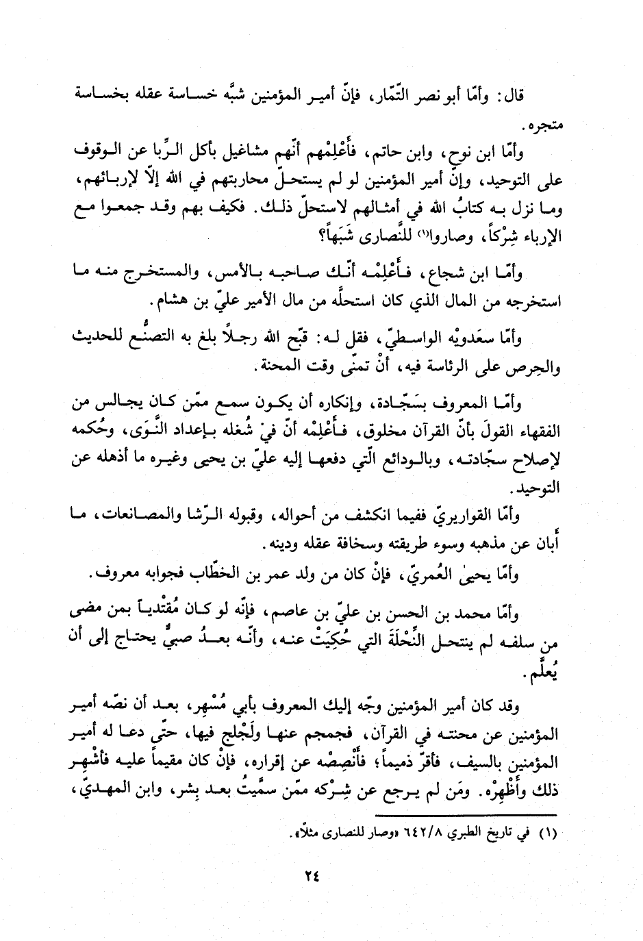 وأمّا المعروف بسَجّادة، وإنكاره أن يكون سمع ممّن كان يجالس من الفقهاء القولَ بأنّ القرآن مخلوق، فأَعْلِمْه أنّ في شُغله بإعداد النَّوَى، وحُكمه لإصلاح سجّادته، وبالودائع الّتي دفعها إليه عليّ بن يحيى وغيره ما أذهله عن التوحيد.