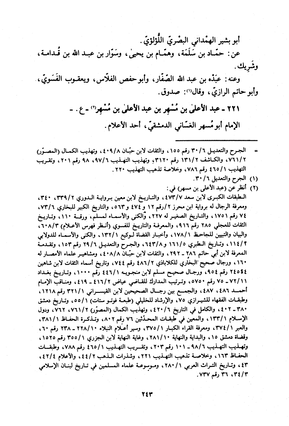 221- عبد الأعلى بن مُسْهِر بن عبد الأعلى بن مسهر [2]- ع. - الإمام أبو مسهر الغسّاني الدمشقيّ، أحد الأعلام.