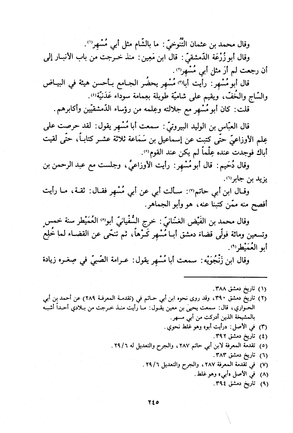 [2] تاريخ دمشق 390، وقد روى نحوه ابن أبي حاتم في (تقدمة المعرفة 289) عن أحمد بن أبي الحواري، قال: سَمِعْتُ يحيى بْن معين يَقُولُ: ما رَأَيْت منذ خرجت من بلادي أحدا أشبه بالمشيخة الذين أدركت من أبي مسهر.