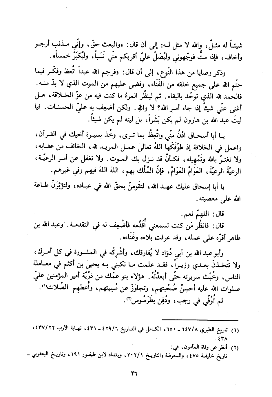 وأبو عبد الله بن أبي دُؤاد لَا يُفارقك، وأشْرِكْه في المشورة في كل أمرك، ولا تتّخذنّ بعدي وزيرًا، فقد علمت ما نكبني به يحيى بن أكثم في معاملة الناس، وخُبْث سريرته حتّى أبعدْتُهُ. هؤلاء بنو عمّك من ذُرِّيَّة أمير المؤمنين عليّ صلوات الله عليه أحسِنْ صُحْبتهم، وتجاوَزْ عن مُسِيئهم، وأَعطهِم الصِّلات [1] .