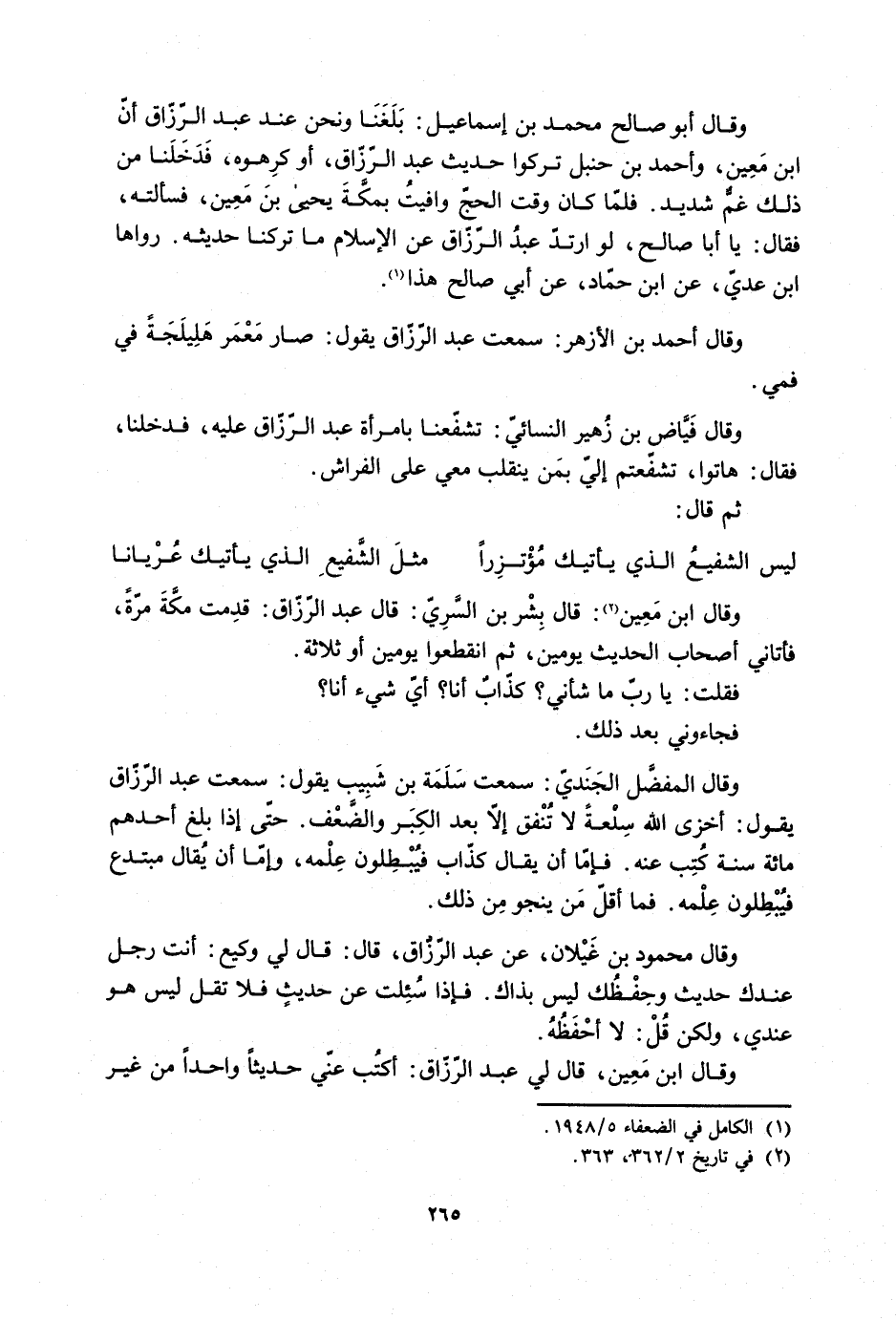 وقال أبو صالح محمد بْن إسماعيل: بَلَغَنَا ونحن عند عبد الرّزّاق، أو كرِهوه، فَدَخَلَنا من ذَلكَ غمٌّ شديد. فلمّا كَانَ وقت الحجّ وافيتُ بمكَّةَ يحيى بنَ مَعِين، فسألته، فقال: يا أبا صالح، لو ارتدّ عبدُ الرّزّاق عَنِ الإسلام ما تركنا حديثه. رواها ابن عديّ، عَنِ ابن حمّاد، عَنْ أَبِي صالح هذا [1] .