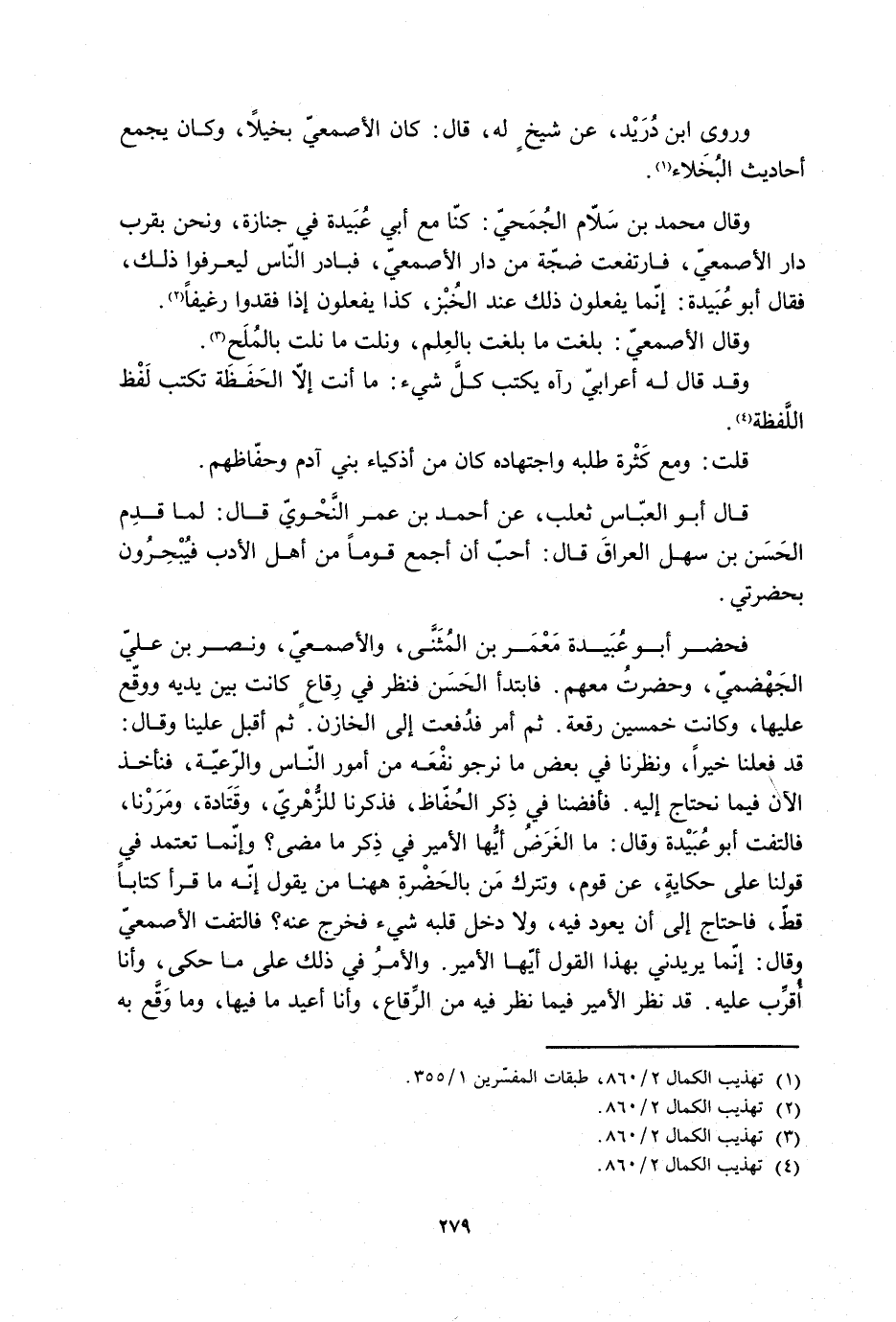 قد فعلنا خيرًا، ونظرنا في بعض ما نرجو نفْعَه من أمور النّاس والرّعيّة، فنأخذ الآن فيما نحتاج إِلَيْهِ. فأفضنا في ذِكر الحُفّاظ، فذكرنا للزُّهْريّ، وقَتَادة، ومَرَرْنا، فالتفت أبو عُبَيْدة وقال: ما الغَرَضُ أيُّها الأمير في ذِكر ما مضى؟ وإنّما تعتمد في قولنا عَلَى حكايةٍ، عَنْ قوم، وتترك مَن بالحضرة هاهنا من يَقُولُ إنّه ما قرأ كتابًا قطّ، فاحتاج إلى أن يعود فيه، ولا دخل قلبه شيء فخرج عَنْهُ؟ فالتفت الأصمعيّ وقال: إنّما يريدني بهذا القول أيّها الأمير. والأمرُ في ذَلكَ عَلَى ما حكى، وأنا أُقرِّب عَلَيْهِ. قد نظر الأمير فيما نظر فيه من الرِّقاع، وأنا أعيد ما فيها، وما وقّع به