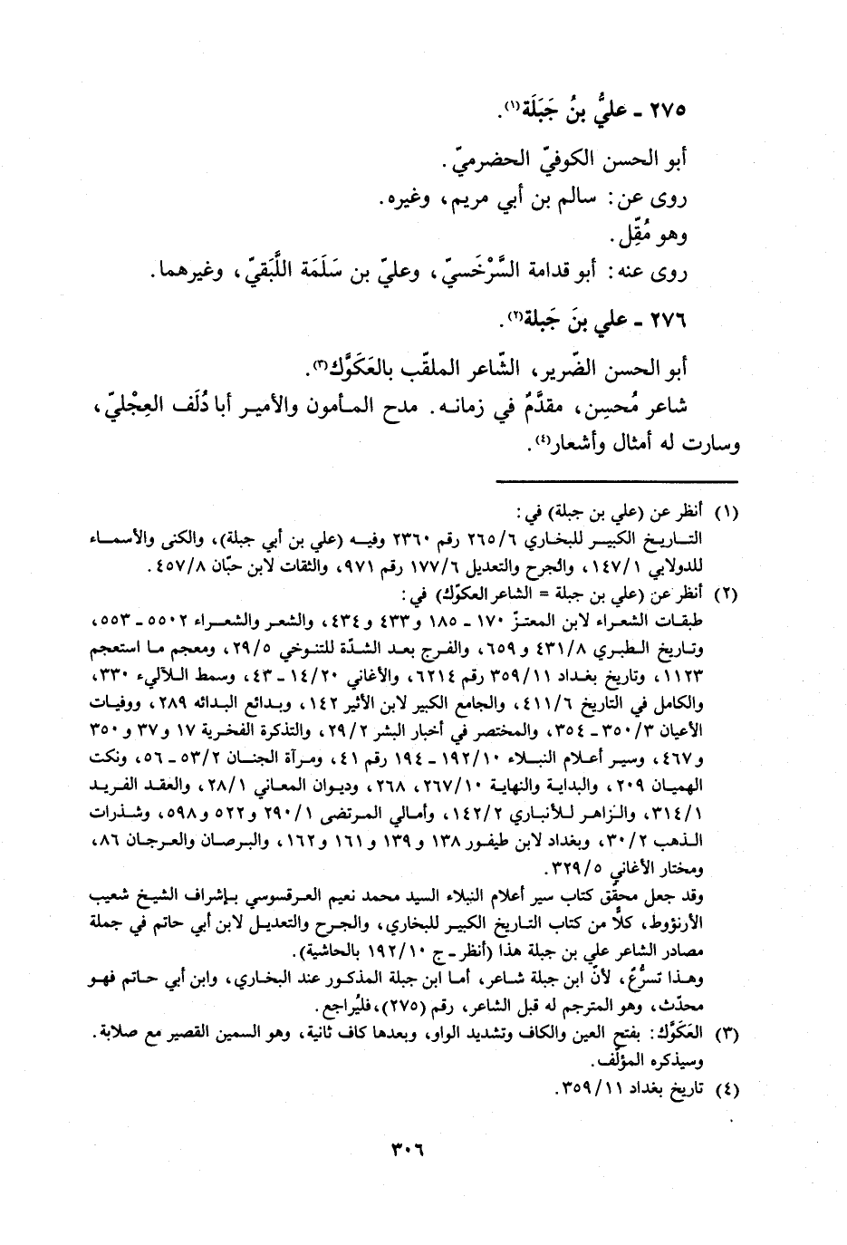 وقد جعل محقّق كتاب سير أعلام النبلاء السيد محمد نعيم العرقسوسي بإشراف الشيخ شعيب الأرنئوط، كلّا من كتاب التاريخ الكبير للبخاريّ، والجرح والتعديل لابن أبي حاتم في جملة مصادر الشاعر علي بن جبلة هذا (انظر- ج 10/ 192 بالحاشية) .