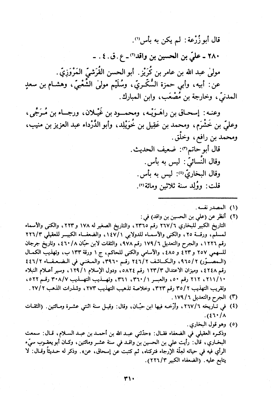 [2] انظر عن (علي بن الحسين بن واقد) في: