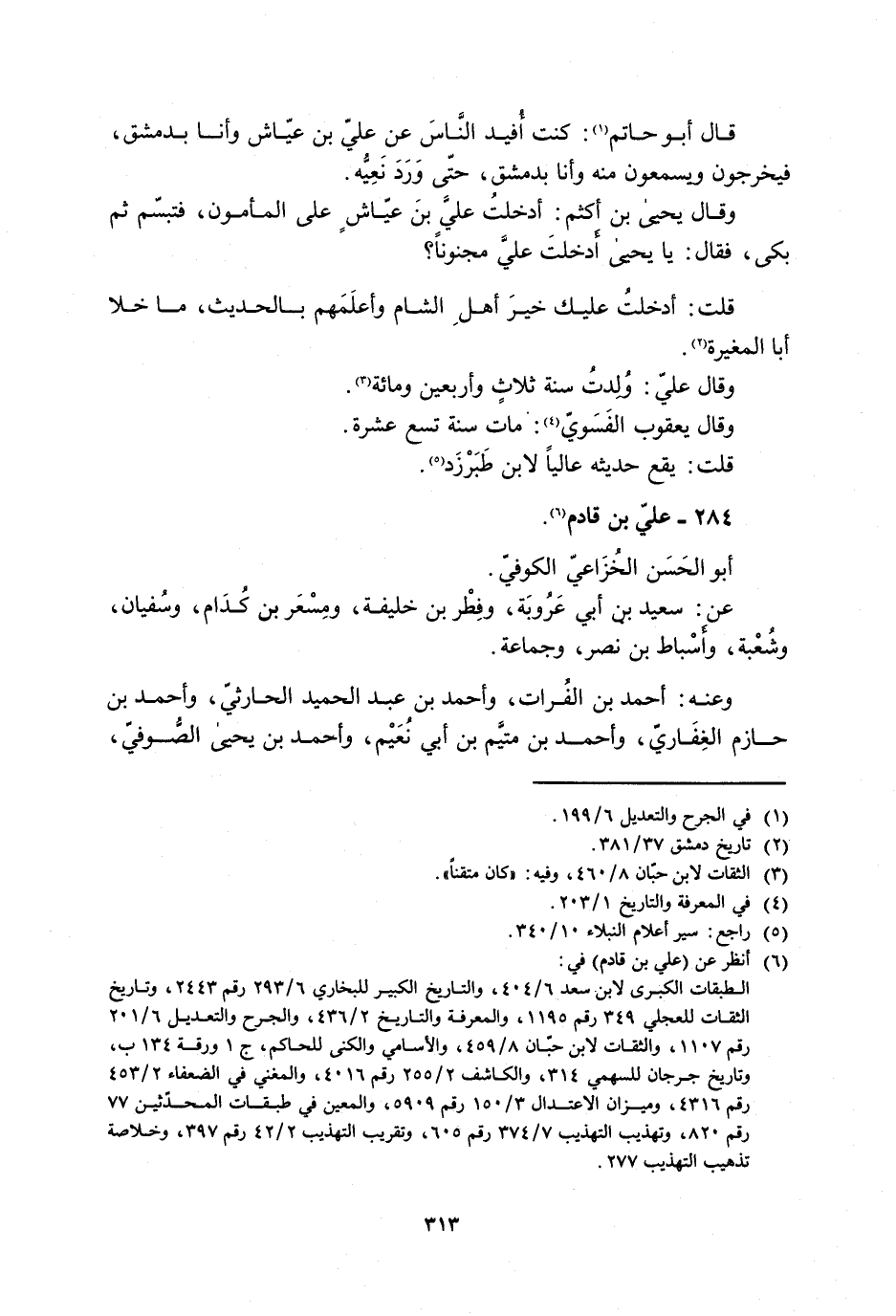 قَالَ أبو حاتم [1] : كنت أُفيد النَّاسَ عَنْ عليّ بْن عيّاش وأنا بدمشق، فيخرجون ويسمعون منه وأنا بدمشق، حتّى وَرَدَ نَعِيُّه.