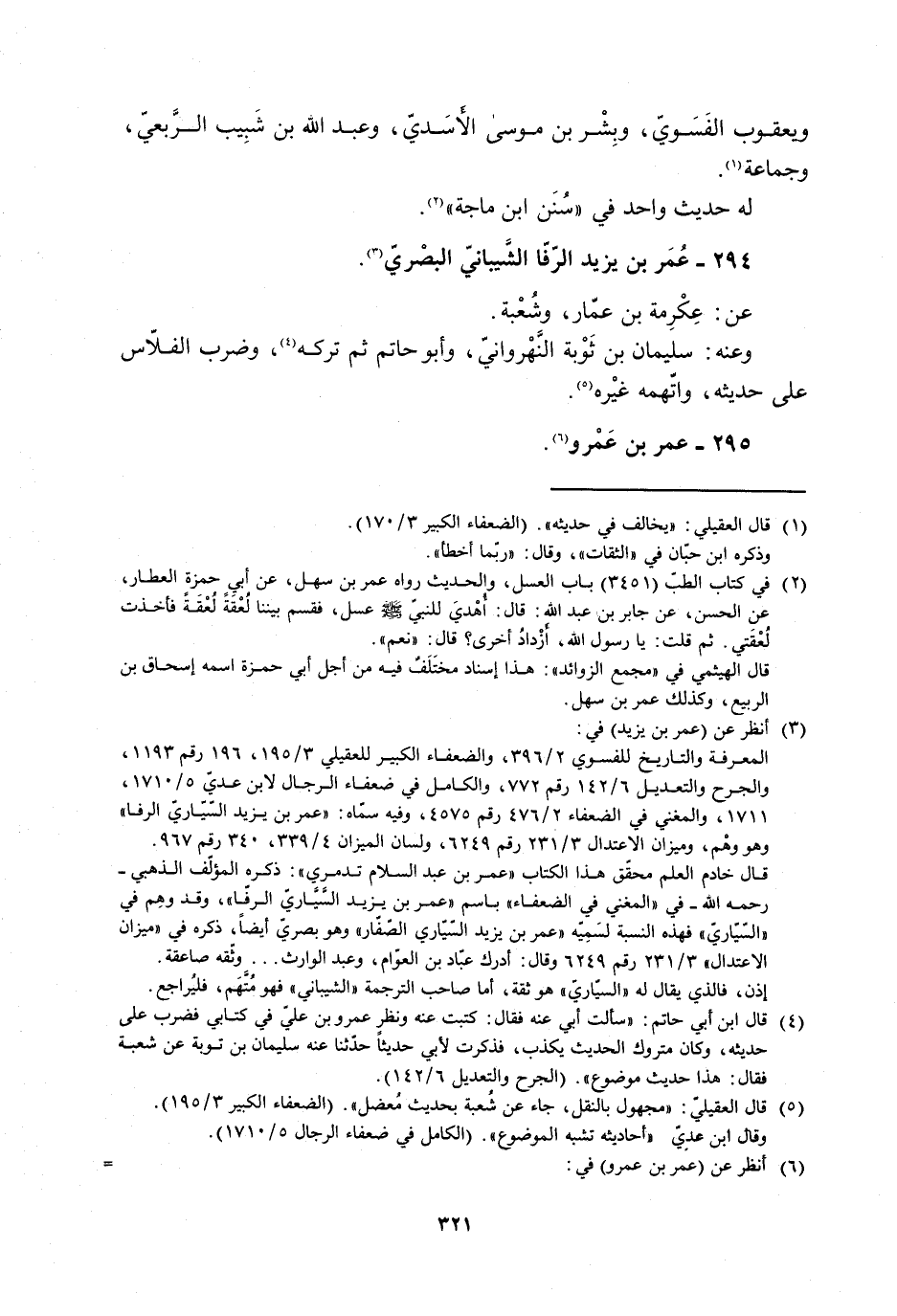 قال خادم العلم محقّق هذا الكتاب «عمر بن عبد السلام تدمري» : ذكره المؤلّف الذهبي- رحمه الله- في «المغني في الضعفاء» باسم «عمر بن يزيد السّيّاريّ الرفّاء» ، وقد وهم في «السّيّاريّ» فهذه النسبة لسميّة «عمر بن يزيد السّيّاري الصّفّار» وهو بصريّ أيضا، ذكره في «ميزان الاعتدال» 3/ 231 رقم 6249 وقال: أدرك عبّاد بن العوّام، وعبد الوارث ... وثّقه صاعقة.