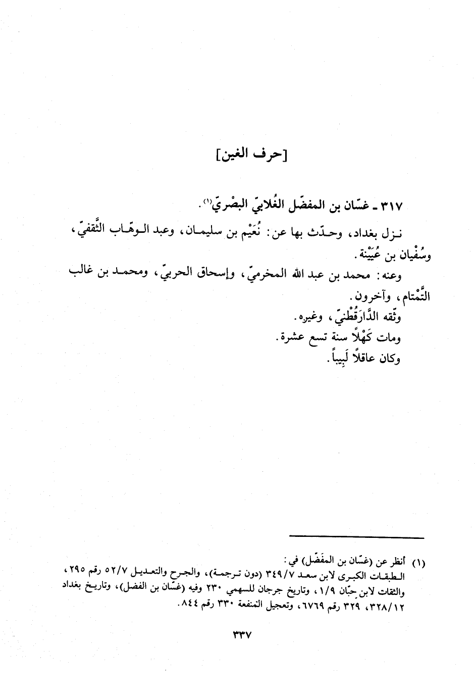 الطبقات الكبرى لابن سعد 7/ 349 (دون ترجمة) ، والجرح والتعديل 7/ 52 رقم 295، والثقات لابن حبّان 9/ 1، وتاريخ جرجان للسهمي 230 وفيه (غسّان بن الفضل) ، وتاريخ بغداد 12/ 328، 329 رقم 6769، وتعجيل المنفعة 330 رقم 844.