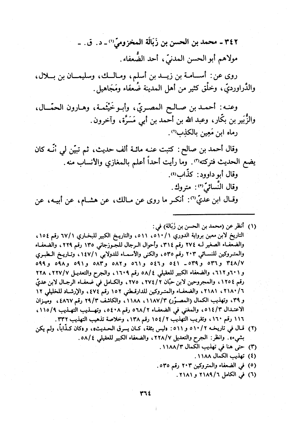342- محمد بن الحسن بن زَبَالَة المخزوميّ [1]- د. ق. - مولاهم أبو الحسن المدنّي، أحد الضُّعفاء.