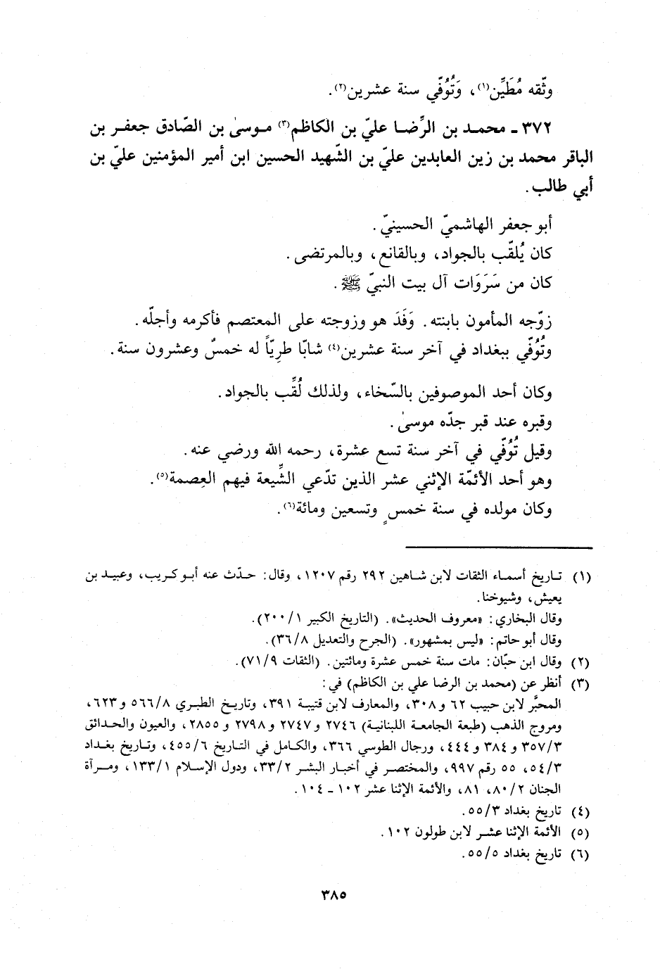 372- محمد بن الرضا علي بن الكاظم [3] موسى بن الصادق جعفر بن الباقر محمد بن زين العابدين علي بن الشهيد الحسين ابْنِ أَمِيرِ الْمُؤْمِنِينَ عَلِيِّ بْنِ أَبِي طَالِبٍ.