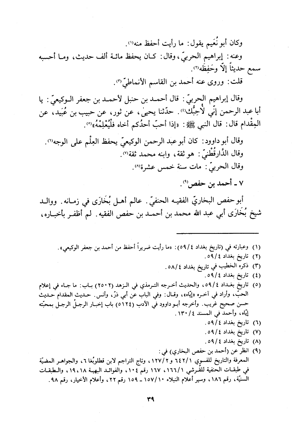 [1] وعبارته في (تاريخ بغداد 4/ 59) : «ما رأيت ضريرا أحفظ من أحمد بن جعفر الوكيعي» .
