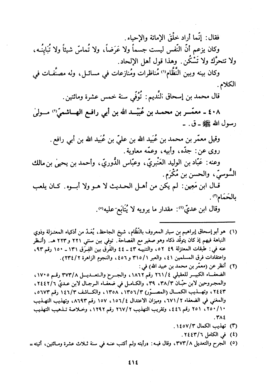 [1] هو أبو إسحاق إبراهيم بن سيار المعروف بالنّظّام، شيخ الجاحظ، يعدّ من أذكياء المعتزلة وذوي النباهة فيهم إذ كان يتوقّد ذكاء وهو صغير مع الفصاحة. توفي بين سنتي 221 و 223 هـ-. (انظر عنه في: طبقات المعتزلة 49 52، والتنبيه 43- 44 والفرق بين الفرق 131- 150 رقم 93، واعتقادات فرق المسلمين 41، والعبر 1/ 315 و 456، والنجوم الزاهرة 2/ 234) .