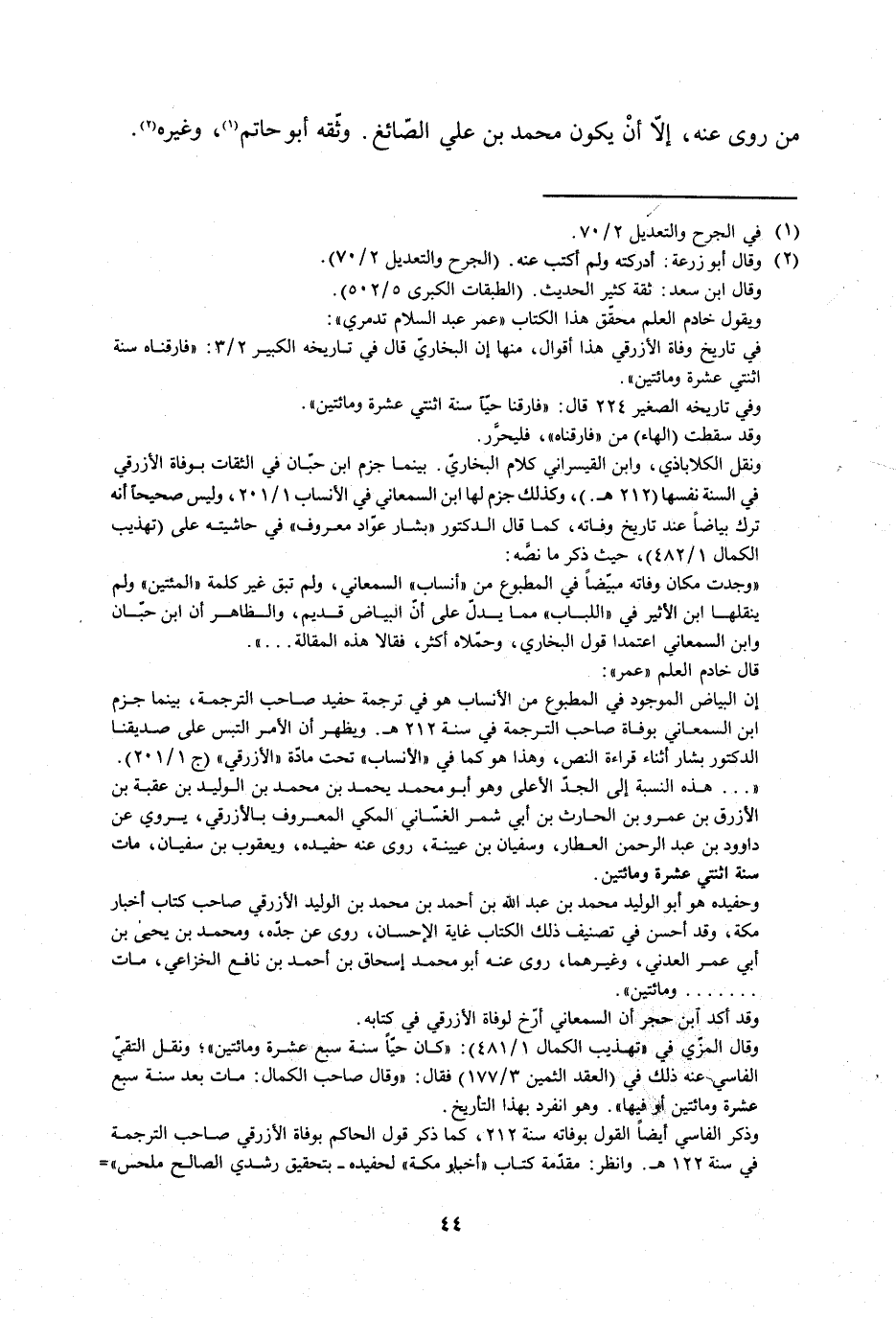 في تاريخ وفاة الأزرقي هذا أقول، منها إن البخاريّ قال في تاريخه الكبير 2/ 3: «فارقناه سنة اثنتي عشرة ومائتين» .