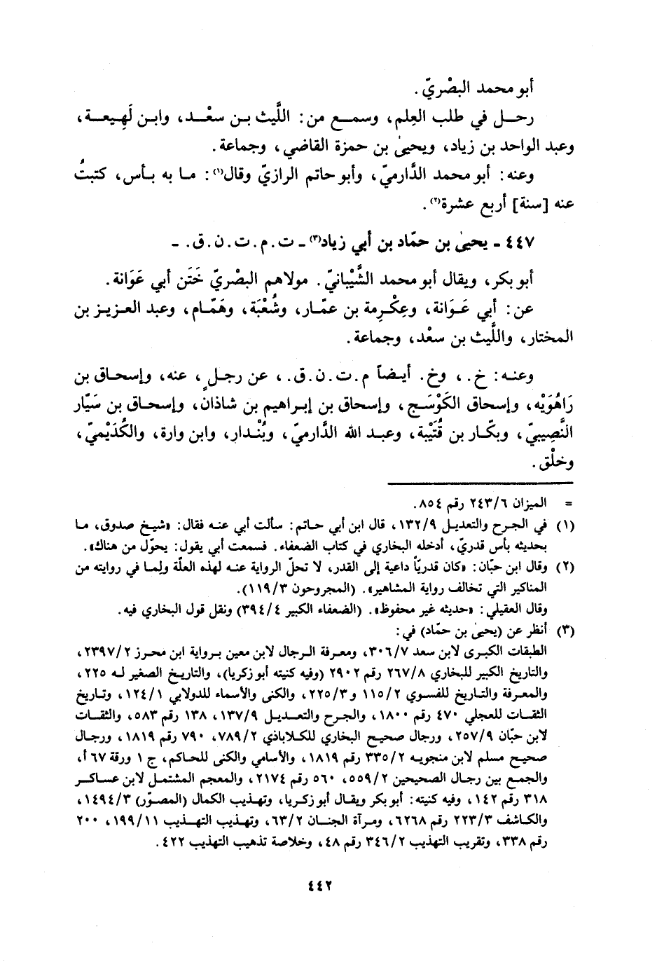 447- يحيى بن حمّاد بن أبي زياد [3]- ت. م. ت. ن. ق. - أبو بكر، ويقال أبو محمد الشّيبانيّ. مولاهم البصْريّ خَتَن أبي عَوَانة.