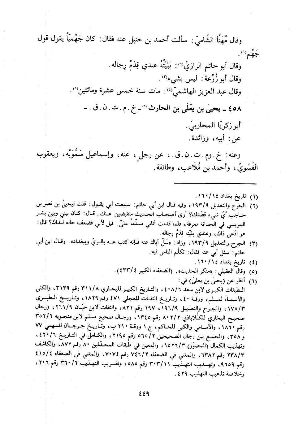 [2] الجرح والتعديل 9/ 193، وفيه قَالَ ابْنُ أَبِي حَاتِمٍ: سَمِعْتُ أَبِي يَقُولُ: قلت ليحيى بن نصر بن حاجب أيّ شيء قصّتك؟ أرى أصحاب الحديث منقبضين عنك. قال: كان بيني وبين بشر المريسي في الحداثة معرفة، فلما قدمت أتاني مسلّما عليّ. قيل لأبي فضعف حاله لذاك؟ قال: