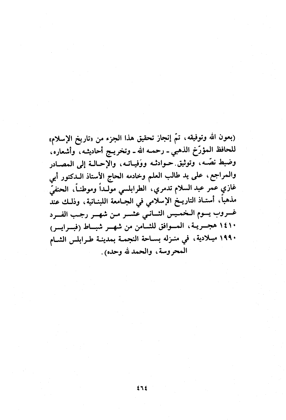 (بعون الله وتوفيقه، تمّ إنجاز تحقيق هذا الجزء من «تاريخ الإسلام» للحافظ المؤرّخ الذهبي- رحمه الله- وتخريج أحاديثه، وأشعاره، وضبط نصّه، وتوثيق حوادثه ووفياته، والإحالة إلى المصادر والمراجع، على يد طالب العلم وخادمه الحاج الأستاذ الدكتور أبي غازي عمر عبد السلام تدمري، الطرابلسي مولدا وموطنا، الحنفيّ مذهبا، أستاذ التاريخ الإسلامي في الجامعة اللبنانية، وذلك عند غروب يوم الخميس الثاني عشر من شهر رجب الفرد 1410 هجرية، الموافق للثامن من شهر شباط (فبراير) 1990 ميلادية، في منزله بساحة النجمة بمدينة طرابلس الشام المحروسة، والحمد للَّه وحده) .
