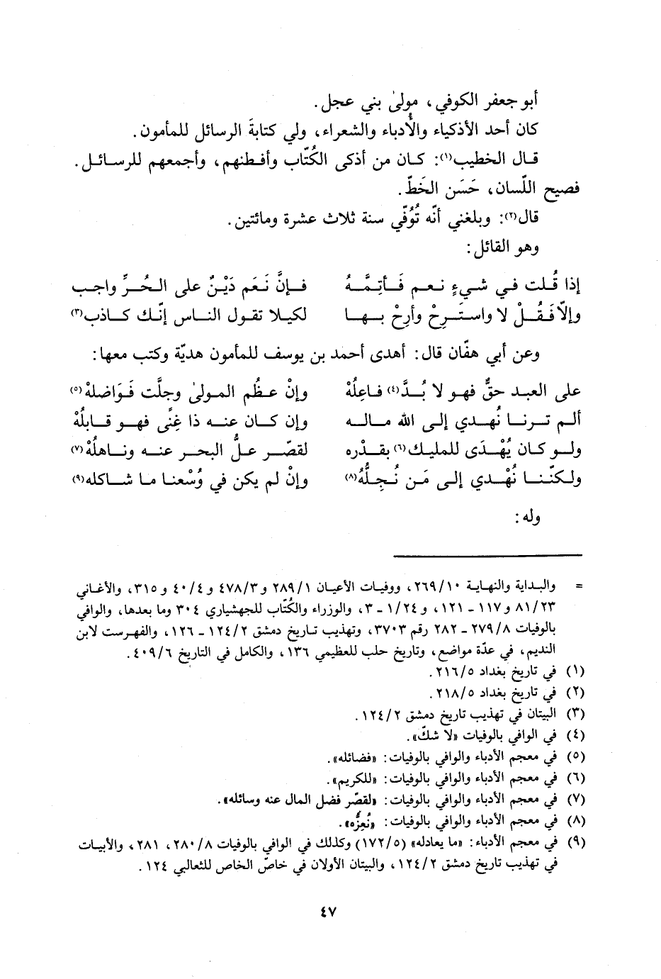 [9] في معجم الأدباء: «ما يعادله» (5/ 172) وكذلك في الوافي بالوفيات 8/ 280، 281، والأبيات في تهذيب تاريخ دمشق 2/ 124، والبيتان الأولان في خاصّ الخاص للثعالبي 124.