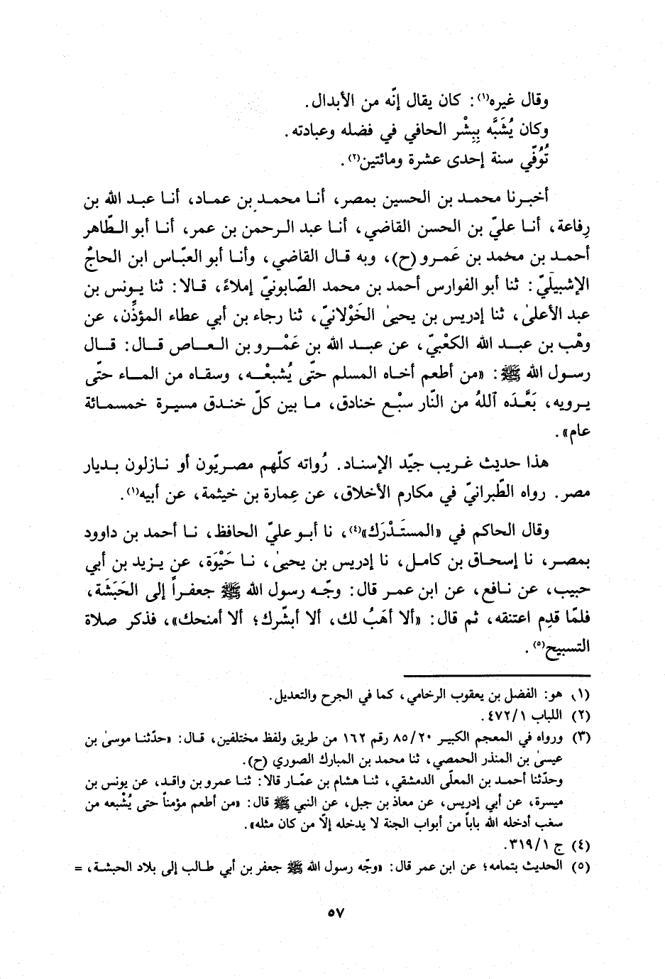 أَخْبَرَنَا مُحَمَّدُ بْنُ الْحُسَيْنِ بِمِصْرَ، أَنَا مُحَمَّدُ بْنُ عِمَادٍ، أَنَا عَبْدُ اللَّهِ بْنُ رِفَاعَةَ، أَنَا عَلِيُّ بْنُ الْحَسَنِ الْقَاضِي، أَنَا عَبْدُ الرَّحْمَنِ بْنُ عُمَرَ، أَنَا أَبُو الطَّاهِرِ أَحْمَدُ بْنُ مُحَمَّدِ بْنِ عَمْرٍو (ح) ، وَبِهِ قَالَ الْقَاضِي، وَأَنَا أبو العبّاس ابن الْحَاجِّ الإِشْبِيلِيُّ: ثَنَا أَبُو الْفَوَارِسِ أَحْمَدُ بْنُ محمد الصّابونيّ إملاء، قالا: ثَنَا يُونُسُ بْنُ عَبْدِ الأَعْلَى، ثَنَا إِدْرِيسُ بْنُ يَحْيَى الْخَوْلانِيُّ، ثَنَا رَجَاءُ بْنُ أَبِي عَطَاءٍ الْمُؤَذِّنُ، عَنْ وَهْبِ بْنِ عَبْدِ اللَّهِ الْكَعْبِيِّ، عَنْ عَبْدِ اللَّهِ بْنِ عَمْرِو بْنِ الْعَاصِ قَالَ: قَالَ رَسُولُ اللَّهِ صَلَّى اللَّهُ عَلَيْهِ وَسَلَّمَ: «مَنْ أَطْعَمَ أَخَاهُ الْمُسْلِمَ حَتَّى يُشْبِعَهُ، وَسَقَاهُ مِنَ الْمَاءِ حَتَّى يَرْوِيَهُ، بَعَّدَهُ اللَّهُ مِنَ النَّارِ سَبْعَ خَنَادِقَ، مَا بَيْنَ كُلِّ خَنْدَقٍ مَسِيرَةُ خَمْسِمِائَةِ عَامٍ» . هَذَا حَدِيثٌ غَرِيبٌ جَيِّدُ الإِسْنَادِ. رُوَاتُهُ كُلُّهُمْ مِصْرِيُّونَ أَوْ نَازِلُونَ بِدِيَارِ مِصْرَ. رَوَاهُ الطَّبَرَانِيُّ فِي مَكَارِمِ الأَخْلاقِ، عَنْ عِمَارَةَ بْنِ خَيْثَمَةَ، عَنْ أَبِيهِ [3] .