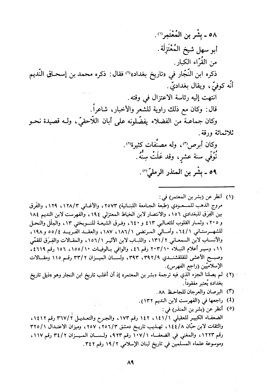 [2] لم يصلنا الجزء الّذي فيه ترجمة «بشر بن المعتمر» إذ أن أغلب تاريخ ابن النجار وهو «ذيل تاريخ بغداد» يعتبر مفقودا.