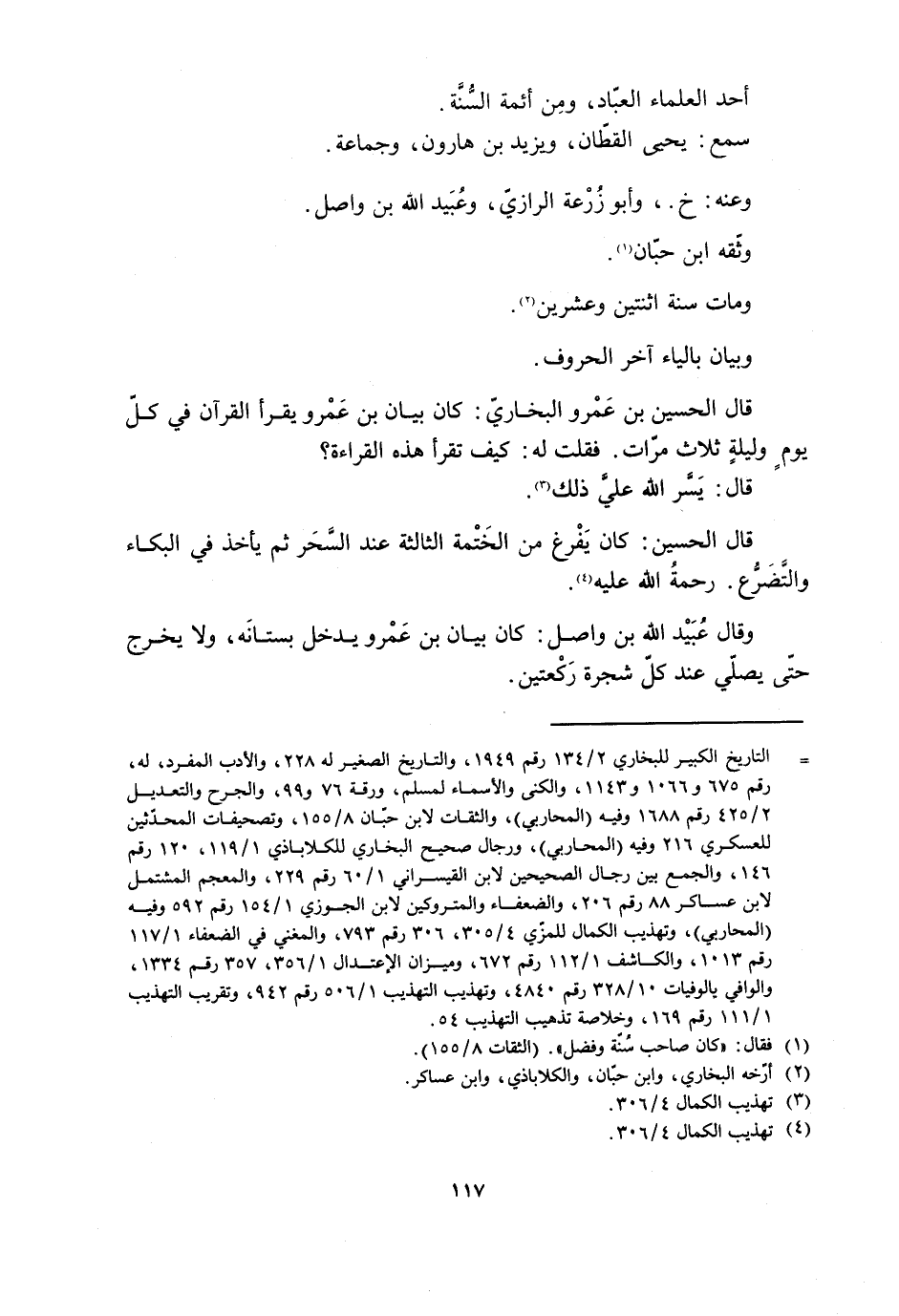 قال الحسين بن عَمْرو البخاريّ: كان بيان بن عَمْرو يقرأ القرآن في كلّ يومٍ وَلَيْلَةٍ ثلاث مرّات. فقلت له: كيف تقرأ هذه القراءة؟