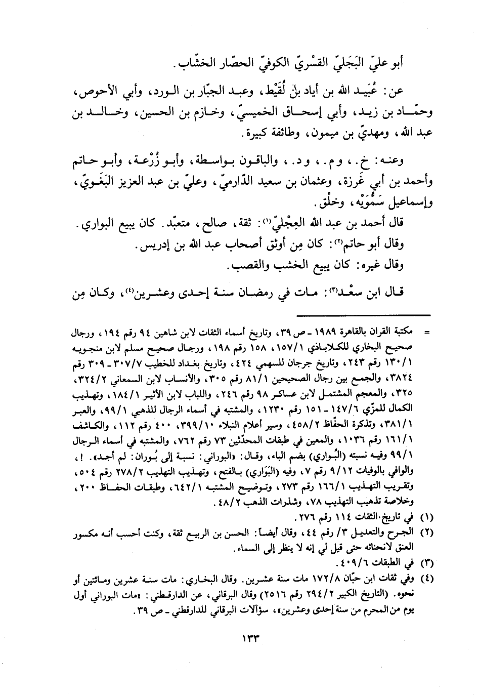 [ () ] مكتبة القرآن بالقاهرة 1989- ص 39، وتاريخ أسماء الثقات لابن شاهين 94 رقم 194، ورجال صحيح البخاري للكلاباذي 1/ 157، 158 رقم 198، ورجال صحيح مسلم لابن منجويه 1/ 130 رقم 243، وتاريخ جرجان للسهمي 424، وتاريخ بغداد للخطيب 7/ 307- 309 رقم 3824، والجمع بين رجال الصحيحين 1/ 81 رقم 305، والأنساب لابن السمعاني 2/ 324، 325، والمعجم المشتمل لابن عساكر 98 رقم 246، واللباب لابن الأثير 1/ 184، وتهذيب الكمال للمزّي 6/ 147- 151 رقم 1230، والمشتبه في أسماء الرجال للذهبي 1/ 99، والعبر 1/ 381، وتذكرة الحفّاظ 2/ 458، وسير أعلام النبلاء 10/ 399، 400 رقم 112، والكاشف 1/ 161 رقم 1036، والمعين في طبقات المحدّثين 73 رقم 762، والمشتبه في أسماء الرجال 1/ 99 وفيه نسبته (البواري) بضم الباء، وقال: «البوراني: نسبة إلى بوران: لم أجد» .!، والوافي بالوفيات 12/ 9 رقم 7، وفيه (البواري) بالفتح، وتهذيب التهذيب 2/ 278 رقم 504، وتقريب التهذيب 1/ 166 رقم 273، وتوضيح المشتبه 1/ 642، وطبقات الحفاظ 200، وخلاصة تذهيب التهذيب 78، وشذرات الذهب 2/ 48.