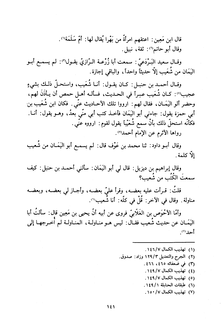 وأمّا الأحْوَص بن الغلابيّ فروى عن أبيه أنّ يحيى بن مَعِين قال: سألتُ أبا اليَمَان عن حديث شُعَيْب فقال: ليس هو مناولة، المناولة لم أخرجها إلى أحد [7] .