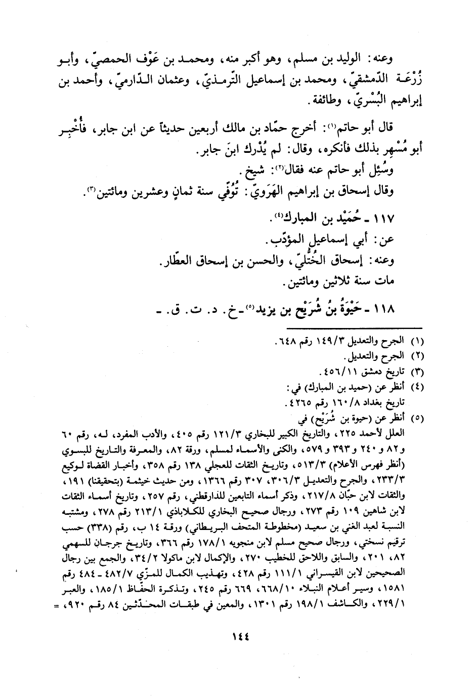 [5] انظر عن (حيوة بن شريح) في العلل لأحمد 225، والتاريخ الكبير للبخاريّ 3/ 121 رقم 405، والأدب المفرد، له، رقم 60 و 82 و 240 و 393 و 579، والكنى والأسماء لمسلم، ورقة 82، والمعرفة والتاريخ للبسوي (انظر فهرس الأعلام) 3/ 513، وتاريخ الثقات للعجلي 138 رقم 358، وأخبار القضاة لوكيع 3/ 233، والجرح والتعديل 3/ 306، 307 رقم 1366، ومن حديث خيثمة (بتحقيقنا) 191، والثقات لابن حبّان 8/ 217، وذكر أسماء التابعين للدارقطنيّ، رقم 257، وتاريخ أسماء الثقات لابن شاهين 109 رقم 273، ورجال صحيح البخاري للكلاباذي 1/ 213 رقم 278، ومشتبه النسبة لعبد الغني بن سعيد (مخطوطة المتحف البريطاني) ورقة 14 ب، رقم (338) حسب ترقيم نسختي، ورجال صحيح مسلم لابن منجويه 1/ 178 رقم 366، وتاريخ جرجان للسهمي 82، 201، والسابق واللاحق للخطيب 270، والإكمال لابن ماكولا 2/ 34، والجمع بين رجال الصحيحين لابن القيسراني 1/ 111 رقم 428، وتهذيب الكمال للمزّي 7/ 482- 484 رقم 1581، وسير أعلام النبلاء 10/ 668، 669 رقم 245، وتذكرة الحفّاظ 1/ 185، والعبر 1/ 229، والكاشف 1/ 198 رقم 1301، والمعين في طبقات المحدّثين 84 رقم 920،