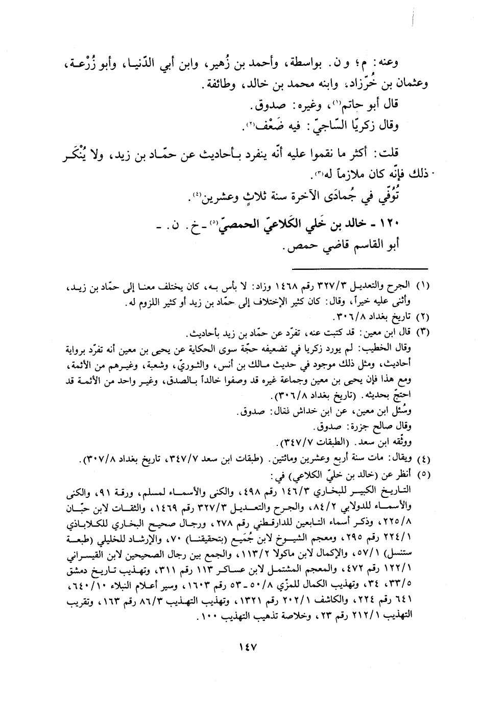120- خالد بن خلي الكلاعيّ الحمصيّ [5]- خ. ن. - أبو القاسم قاضي حمص.