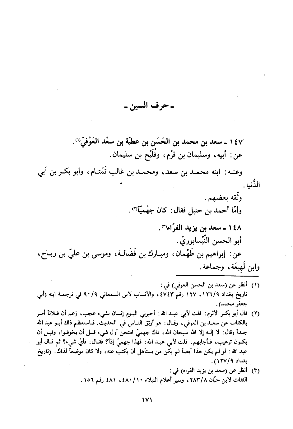 [2] قال أبو بكر الأثرم: قلت لأبي عبد الله: أخبرني اليوم إنسان بشيء عجب، زعم أن فلانا أمر بالكتاب عن سعد بن العوفيّ، وقال: هو أوثق الناس في الحديث. فاستعظم ذاك أبو عبد الله جدا وقال: لا إله إلا الله سبحان الله، ذاك جهميّ امتحن أول شيء قبل أن يخوفوا، وقبل أن يكون ترهيب، فأجابهم. قلت لأبي عبد الله: فهذا جهميّ إذا؟ فقال: فأيّ شيء؟ ثم قال أبو عبد الله: لو لم يكن هذا أيضا لم يكن من يستأهل أن يكتب عنه، ولا كان موضعا لذاك. (تاريخ بغداد 9/ 127) .