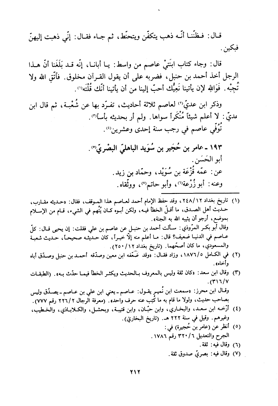 [1] تاريخ بغداد 12/ 248، وقد حفظ الإمام أحمد لعاصم هذا الموقف، فقال: «حديثه مقارب، حديث أهل الصدق، ما أقلّ الخطأ فيه، ولكن أبوه كان يتّهم في الشيء، قام من الإسلام بموضع، أرجو أن يثيبه الله به الجنة» .