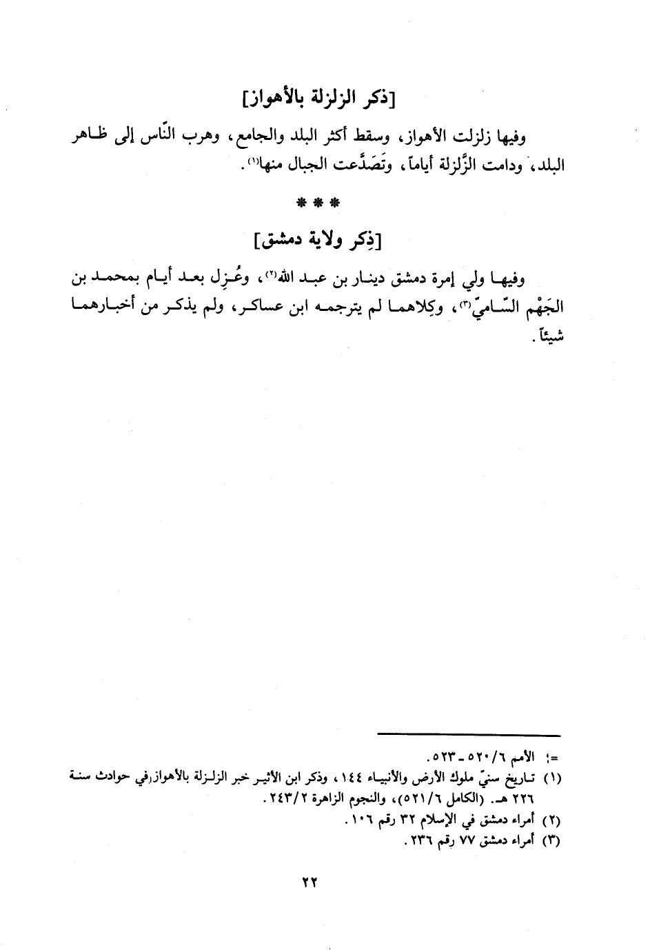 [1] تاريخ سنيّ ملوك الأرض والأنبياء 144، وذكر ابن الأثير خبر الزلزلة بالأهواز في حوادث سنة 226 هـ. (الكامل 6/ 521) ، والنجوم الزاهرة 2/ 243.