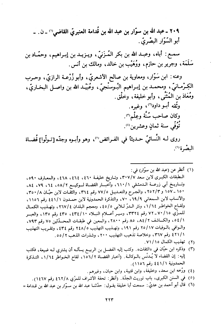 209- عبد الله بن سوار بن عبد الله بن قدامة العنبري القاضي [1]- ن. - أبو السّوّار البصريّ.
