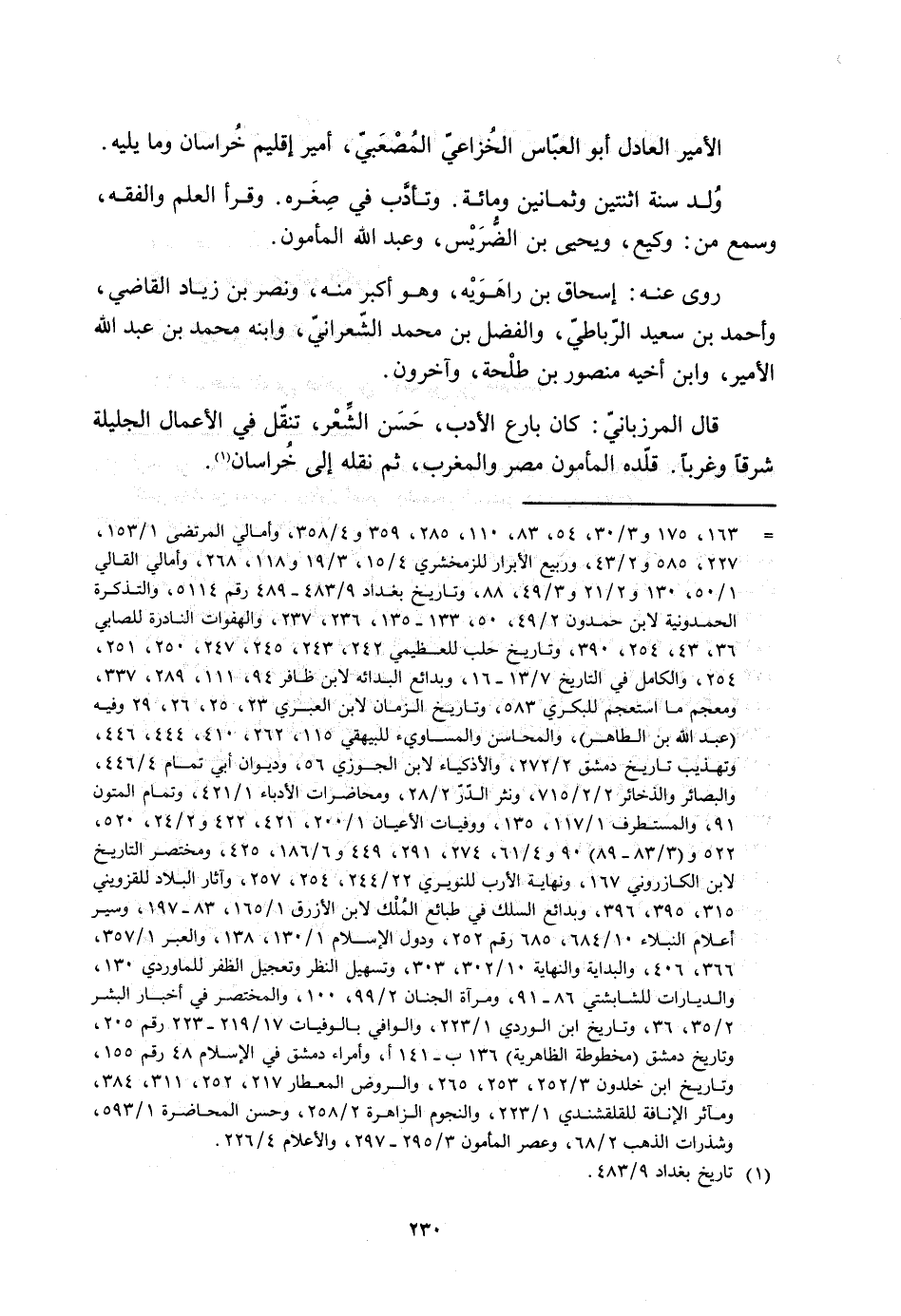 [163، 175] و 3/ 30، 54، 83، 110، 285، 359 و 4/ 358، وأمالي المرتضى 1/ 153، 227، 585 و 2/ 43، وربيع الأبرار للزمخشري 4/ 15، 3/ 19 و 118، 268، وأمالي القالي 1/ 50، 130 و 2/ 21 و 3/ 49، 88، وتاريخ بغداد 9/ 483- 489 رقم 5114، والتذكرة الحمدونية لابن حمدون 2/ 49، 50، 133- 135، 236، 237، والهفوات النادرة للصابي 36، 43، 254، 390، وتاريخ حلب للعظيميّ 242، 243، 245، 247، 250، 251، 254، والكامل في التاريخ 7/ 13- 16، وبدائع البدائه لابن ظافر 94، 111، 289، 337، ومعجم ما استعجم للكبري 583، وتاريخ الزمان لابن العبري 23، 25، 26، 29 وفيه (عبد الله بن الطاهر) ، والمحاسن والمساوئ للبيهقي 115، 262، 410، 444، 446، وتهذيب تاريخ دمشق 2/ 272، والأذكياء لابن الجوزي 56، وديوان أبي تمام 4/ 446، والبصائر والذخائر 2/ 2/ 715، ونثر الدّرّ 2/ 28، ومحاضرات الأدباء 1/ 421، وتمام المتون 91، والمستطرف 1/ 117، 135، ووفيات الأعيان 1/ 200، 421، 422 و 2/ 24، 520، 522 و (3/ 83- 89) 90 و 4/ 61، 274، 291، 449 و 6/ 186، 425، ومختصر التاريخ لابن الكازروني 167، ونهاية الأرب للنويري 22/ 244، 254، 257، وآثار البلاد للقزويني 315، 395، 396، وبدائع السلك في طبائع الملك لابن الأزرق 1/ 165، 83- 197، وسير أعلام النبلاء 10/ 684، 685 رقم 252، ودول الإسلام 1/ 130، 138، والعبر 1/ 357، 366، 406، والبداية والنهاية 10/ 302، 303، وتسهيل النظر وتعجيل الظفر للماوردي 130، والديارات للشابشتي 86- 91، ومرآة الجنان 2/ 99، 100، والمختصر في أخبار البشر 2/ 35، 36، وتاريخ ابن الوردي 1/ 223، والوافي بالوفيات 17/ 219- 223 رقم 205، وتاريخ دمشق (مخطوطة الظاهرية) 136 ب- 141 أ، وأمراء دمشق في الإسلام 48 رقم 155، وتاريخ ابن خلدون 3/ 252، 253، 265، والروض المعطار 217، 252، 311، 384، ومآثر الإنافة للقلقشندي 1/ 223، والنجوم الزاهرة 2/ 258، وحسن المحاضرة 1/ 593، وشذرات الذهب 2/ 68، وعصر المأمون 3/ 295- 297، والأعلام 4/ 226.