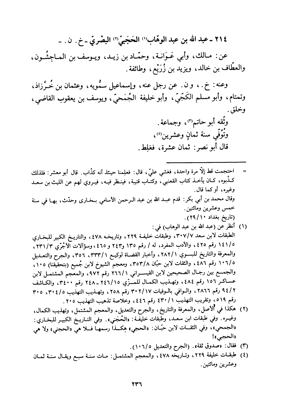 214- عبد الله بن عبد الوهّاب [1] الحجبي [2] البصري- خ. ن. - عن: مالك، وأبي عَوَانة، وحمّاد بن زيد، ويوسف بن الماجِشُون، والعطّاف بن خالد، ويزيد بن زُرَيْع، وطائفة.