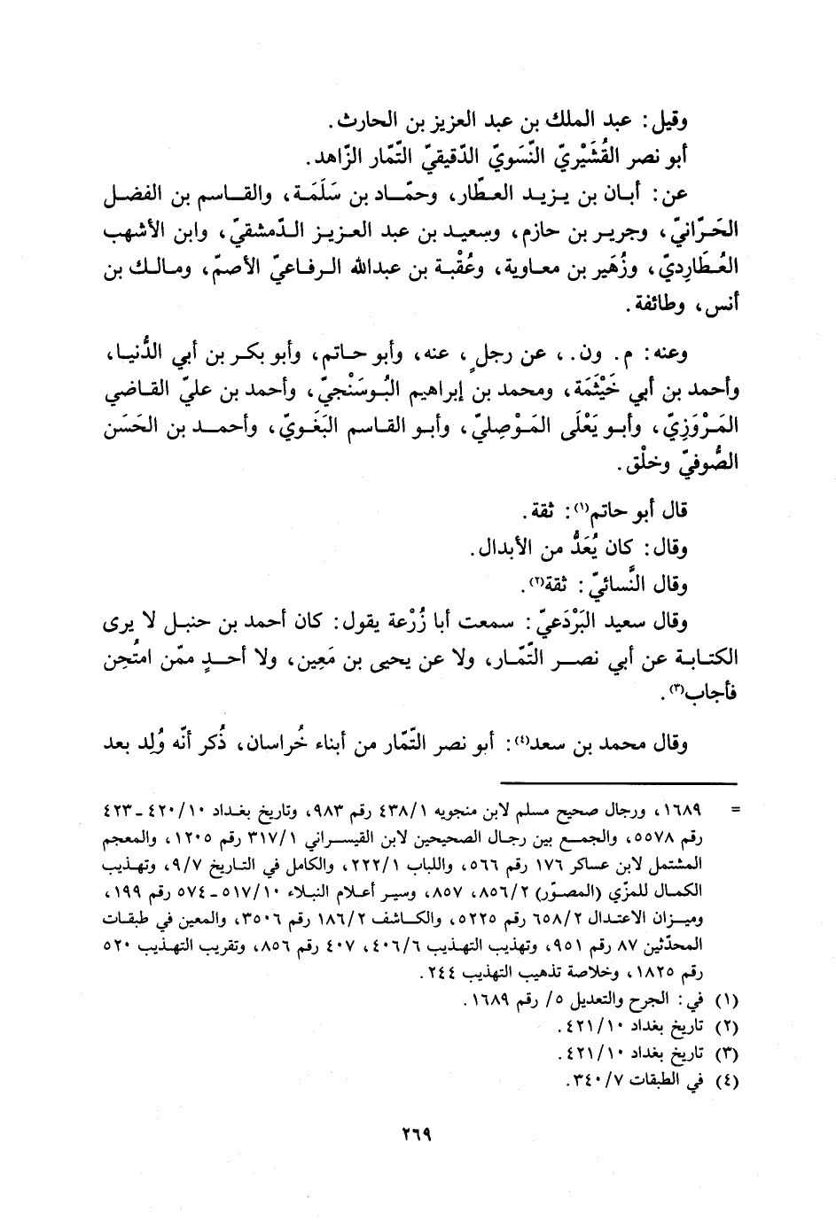 [1689،) ] ورجال صحيح مسلم لابن منجويه 1/ 438 رقم 983، وتاريخ بغداد 10/ 420- 423 رقم 5578، والجمع بين رجال الصحيحين لابن القيسراني 1/ 317 رقم 1205، والمعجم المشتمل لابن عساكر 176 رقم 566، واللباب 1/ 222، والكامل في التاريخ 7/ 9، وتهذيب الكمال للمزّي (المصوّر) 2/ 856، 857، وسير أعلام النبلاء 10/ 517- 574 رقم 199، وميزان الاعتدال 2/ 658 رقم 5225، والكاشف 2/ 186 رقم 3506، والمعين في طبقات المحدّثين 87 رقم 951، وتهذيب التهذيب 6/ 406، 407 رقم 856، وتقريب التهذيب 520 رقم 1825، وخلاصة تذهيب التهذيب 244.