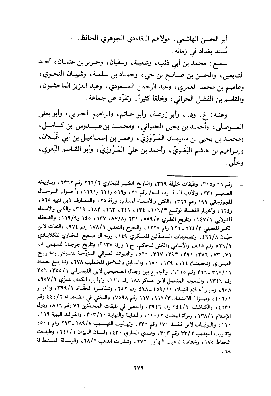 [ () ] رقم 66 و 305، وطبقات خليفة 329، والتاريخ الكبير للبخاريّ 6/ 266 رقم 2362، وتاريخه الصغير 231، والأدب المفرد، له/ رقم 20، و 599 و 611 و 1161، وأحوال الرجال للجوزجانيّ 199 رقم 366، والكنى والأسماء لمسلم، ورقة 25، والمعارف لابن قتيبة 525، و 624، وأخبار القضاة لوكيع 3/ 106، 134، 241، 263، 283، 319، والكنى والأسماء للدولابي 1/ 147، وتاريخ الطبري 7/ 559، 631 و 8/ 87، 637، 645 و 9/ 119، والضعفاء الكبير للعقيليّ 3/ 224- 226 رقم 1225، والجرح والتعديل 6/ 178 رقم 974، والثقات لابن حبّان 8/ 466، وتصحيفات المحدّثين للعسكريّ 149، ورجال صحيح البخاري للكلاباذي 2/ 526 رقم 815، والأسامي والكنى للحاكم، ج 1 ورقة 135 أ، وتاريخ جرجان للسهمي 5، 72، 73، 386، 391، 393، 397، 520، والفوائد العوالي المؤرّخة للتنوخي بتخريج الصوري (تحقيقنا) 124، 139، 150، والسابق واللاحق للخطيب 278، وتاريخ بغداد 11/ 360- 366 رقم 6215، والجمع بين رجال الصحيحين لابن القيسراني 1/ 355، 356 رقم 1346، والمعجم المشتمل لابن عساكر 188 رقم 616، وتهذيب الكمال للمزّي 2/ 957، 958، وسير أعلام النبلاء 10/ 459- 468 رقم 252، وتذكرة الحفّاظ 1/ 399، والعبر 1/ 406، وميزان الاعتدال 3/ 116، 117 رقم 7598، والمغني في الضعفاء 2/ 444 رقم 4231، والكاشف 2/ 244 رقم 3946، والمعين في طبقات المحدّثين 76 رقم 816، ودول الإسلام 1/ 138، ومرآة الجنان 2/ 100، والبداية والنهاية 10/ 303، والفوائد البهية 119، 120، والوفيات لابن قنفذ 170 رقم 230، وتهذيب التهذيب 7/ 289- 293 رقم 501، وتقريب التهذيب 2/ 33 رقم 303، وهدي الساري 430، ولسان الميزان 6/ 641، وطبقات الحفاظ 175، وخلاصة تذهيب التهذيب 272، وشذرات الذهب 2/ 68، والرسالة المستطرفة 68.