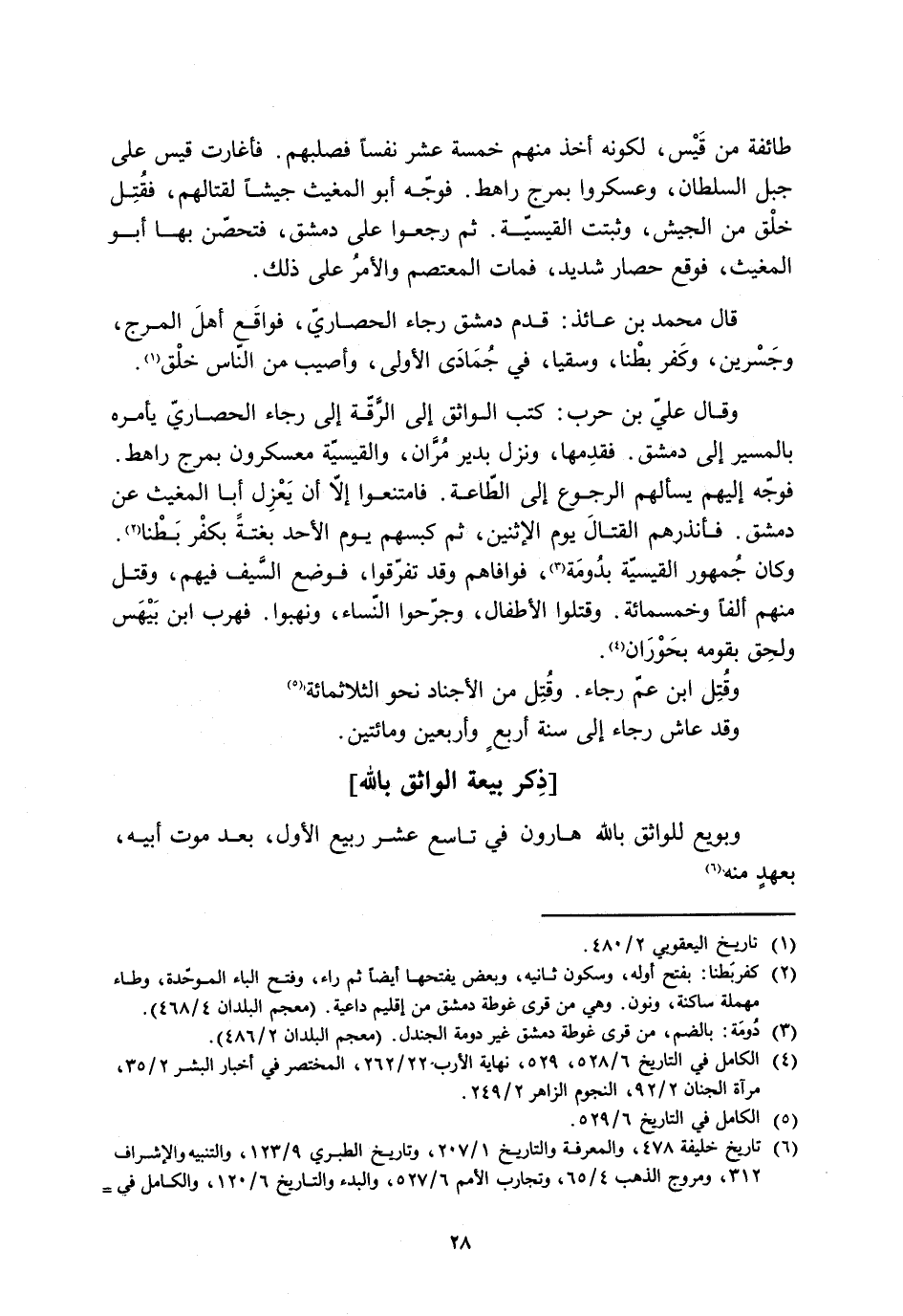 [6] تاريخ خليفة 478، والمعرفة والتاريخ 1/ 207، وتاريخ الطبري 9/ 123، والتنبيه والإشراف 312، ومروج الذهب 4/ 65، وتجارب الأمم 6/ 527، والبدء والتاريخ 6/ 120، والكامل في