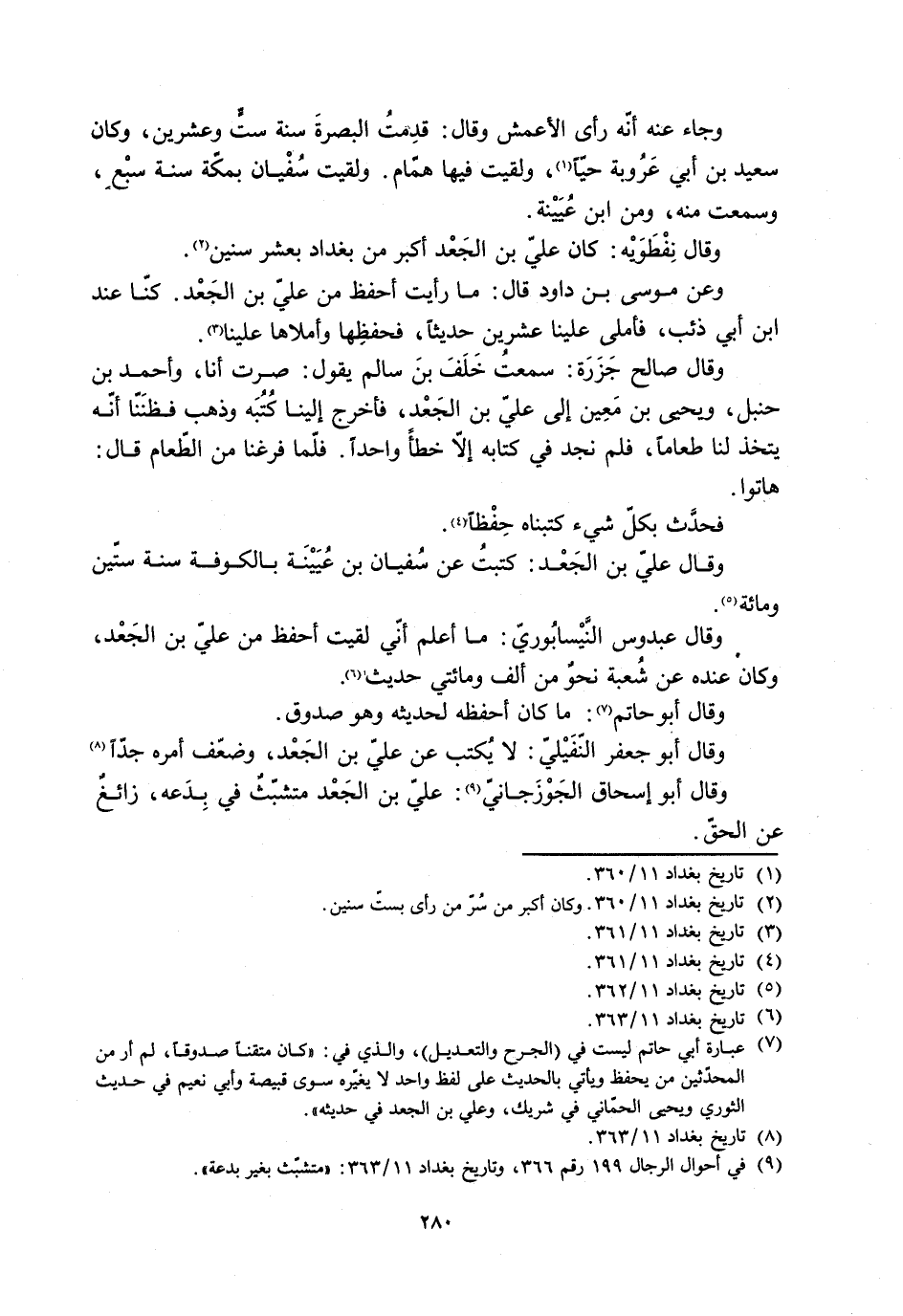 وقال أبو جعفر النُّفَيْليّ: لا يُكْتَب عن عليّ بن الْجَعْد، وضعّف أمره جدًا [8] وقال أبو إسحاق الْجَوْزجانيّ [9] : عليّ بن الْجَعْد متشبّث في بدعة، زائغ عن الحقّ.